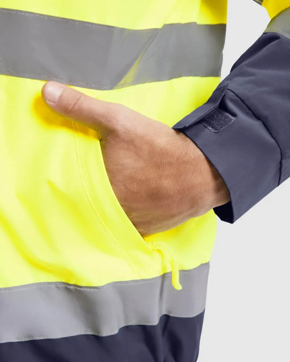 Parka acolchada de alta visibilidad combinada en dos colores. · Capucha enrollable con cordón ajustable y ribete flúor. · Bolsillo en la zona del pecho con cremallera. · Dos cintas reflectantes en el cuerpo y las mangas. · Mangas desmontables. · Dos bolsillos frontales ligeramente inclinados de fácil acceso. · Puños ajustables por zona elástica y por cierres en velcro. · Tapeta central con cierre de velcro y cremallera central flúor con tirador. · Acceso interior para serigrafía. · Bajo con zona elástica.