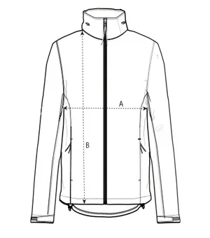Cuello alto y manga pegada Bajo ceñido con cordón elástico y tope de plástico Cremallera de nailon invertida en el centro Bolsillos exteriores con cremallera y ribete y tirador elástico reflectante Forro polar interior integrado Paneles laterales elásticos para una mejor forma Mangas ceñidas con velcro ajustable Costuras interiores rematadas con ribetes reciclados Impermeable Transpirable y cortavientos