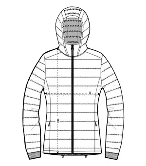 Manga pegada Cuello alto con capucha desmontable con cierres metálicos ocultos en acabado mate Abertura de la capucha con tope de plástico ajustable y cordón elástico Cremallera central delantera de nylon invertida Bolsillos de ojal con cremallera y tirador de grogrén Enteramente acolchada Piezas laterales para mejorar el corte Suave canalé 1×1 en puños Costuras interiores ribeteadas