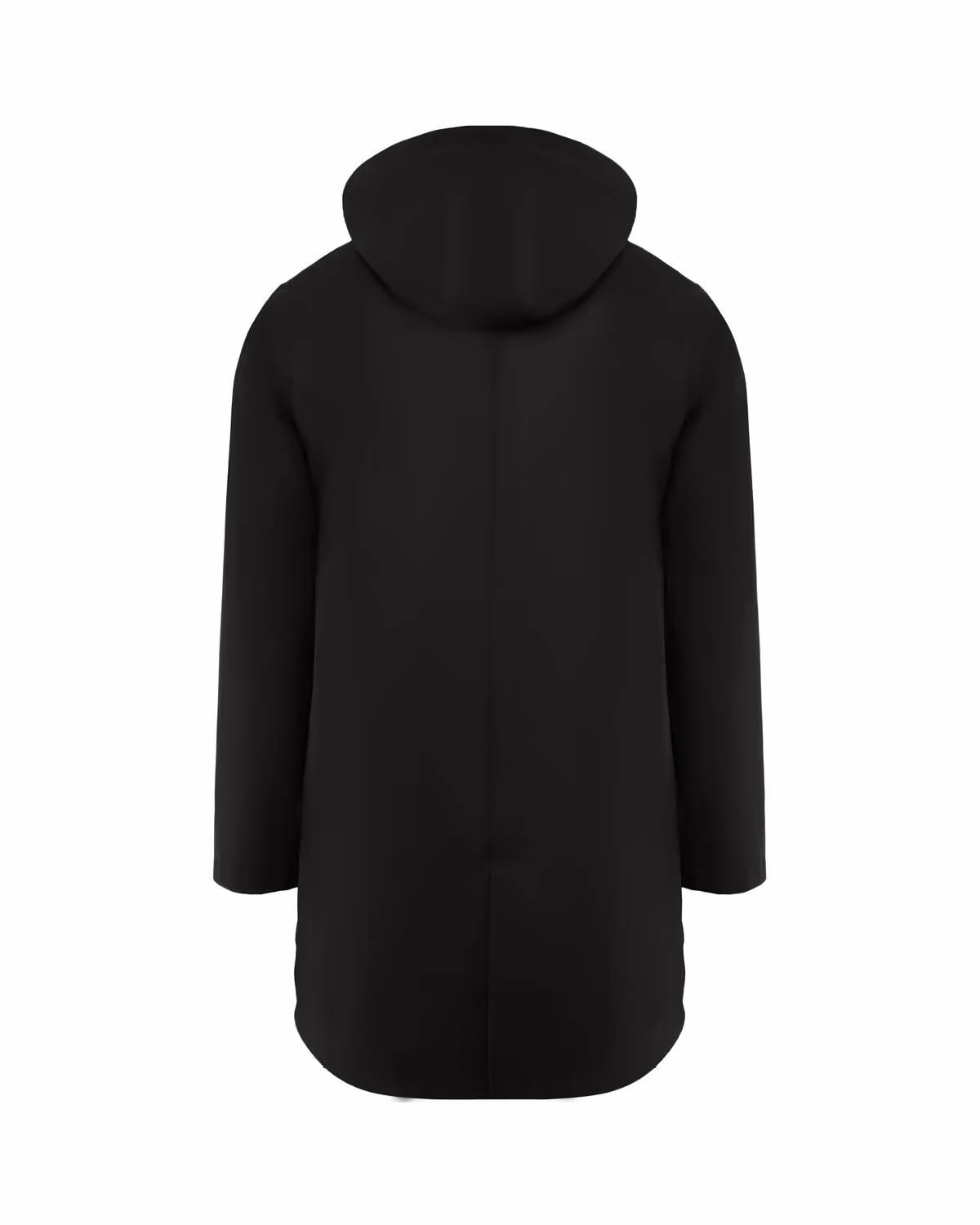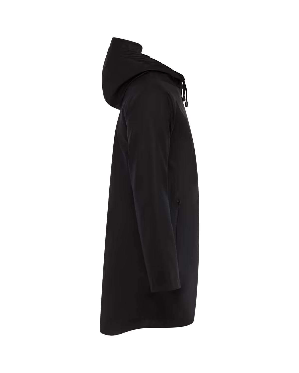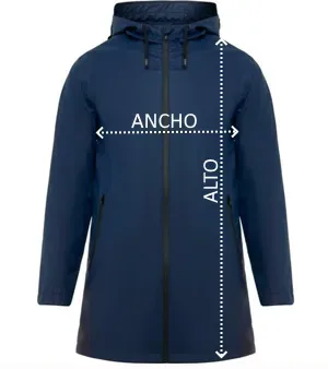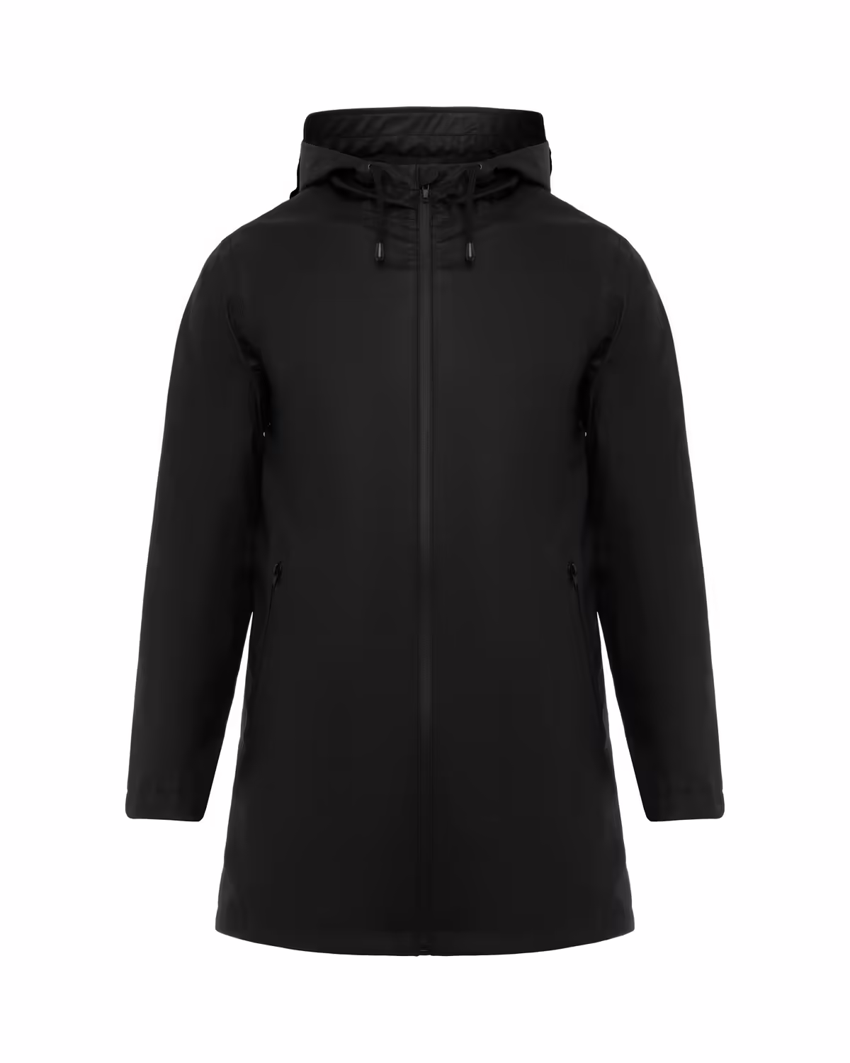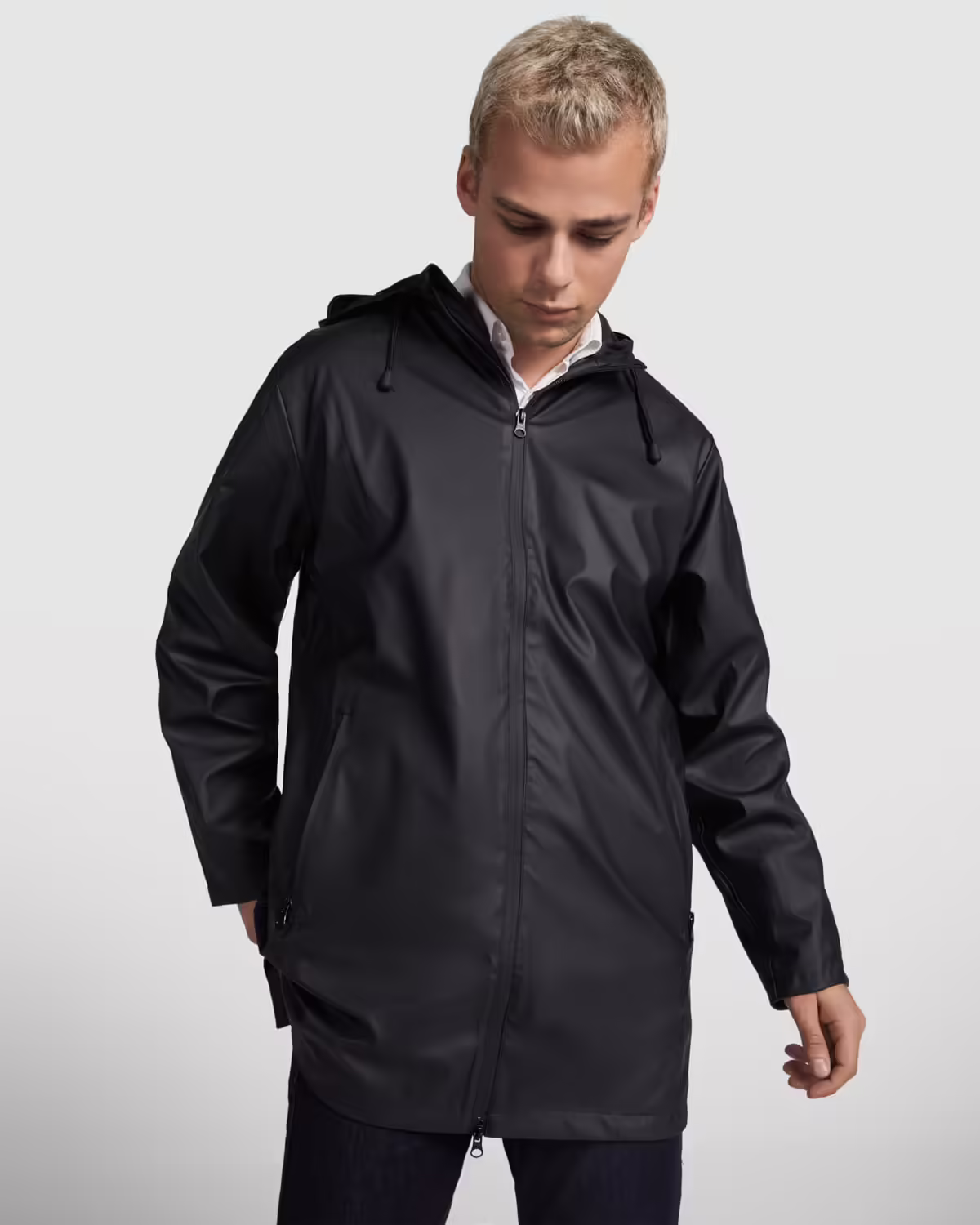 Chubasquero impermeable. · Capucha fija con visera. · Cremalleras y costuras termoselladas. · Detalles a contraste en color negro. · Dos bolsillos laterales con cremallera. · Bajo posterior con apertura. · Acceso interior para marcaje.