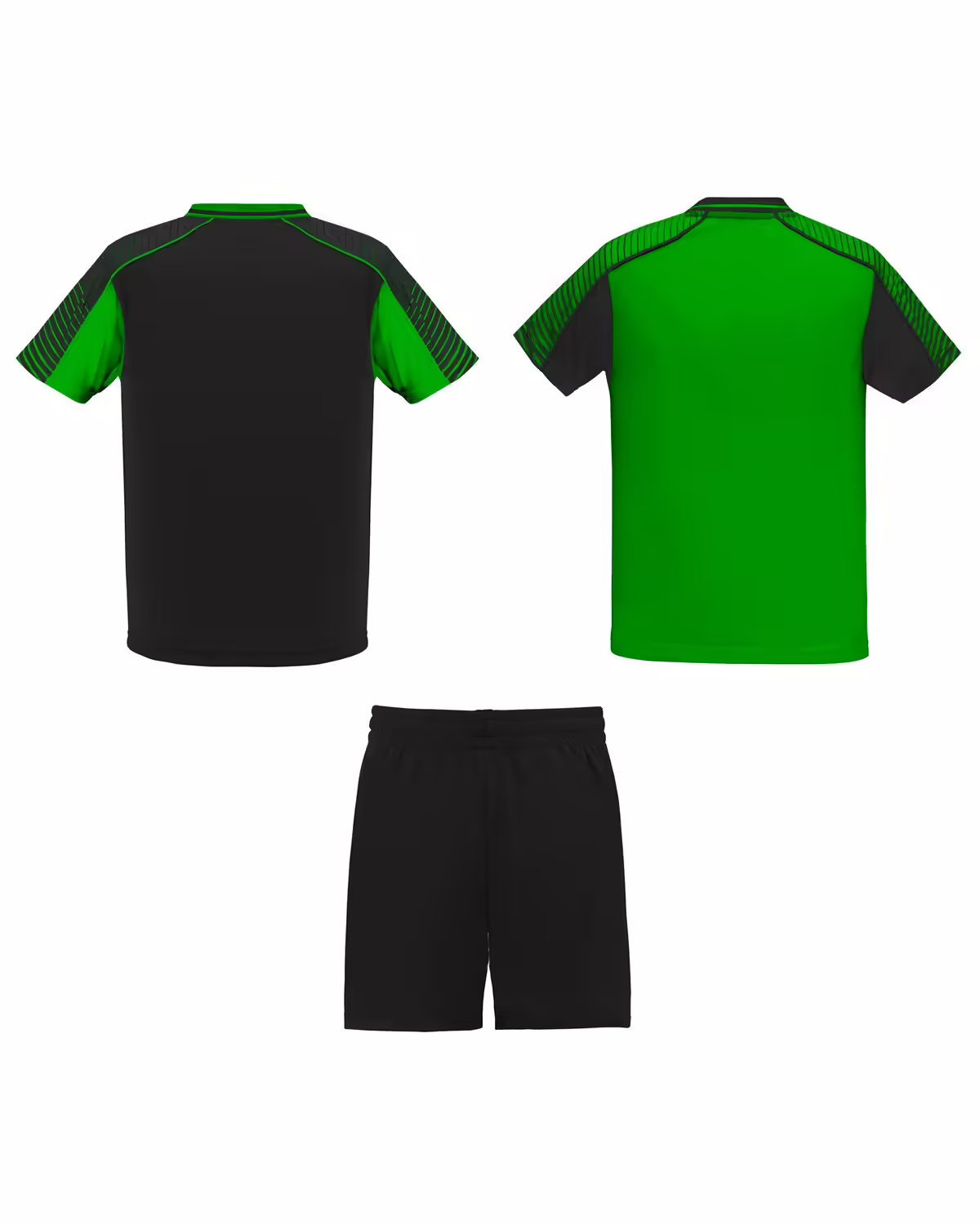 - Estética: manga semi ranglan estampadas en las camisetas, cuello redondo con tricot en la parte posterior. Banda lateral a contraste y abertura lateral en el bajo del pantalón.