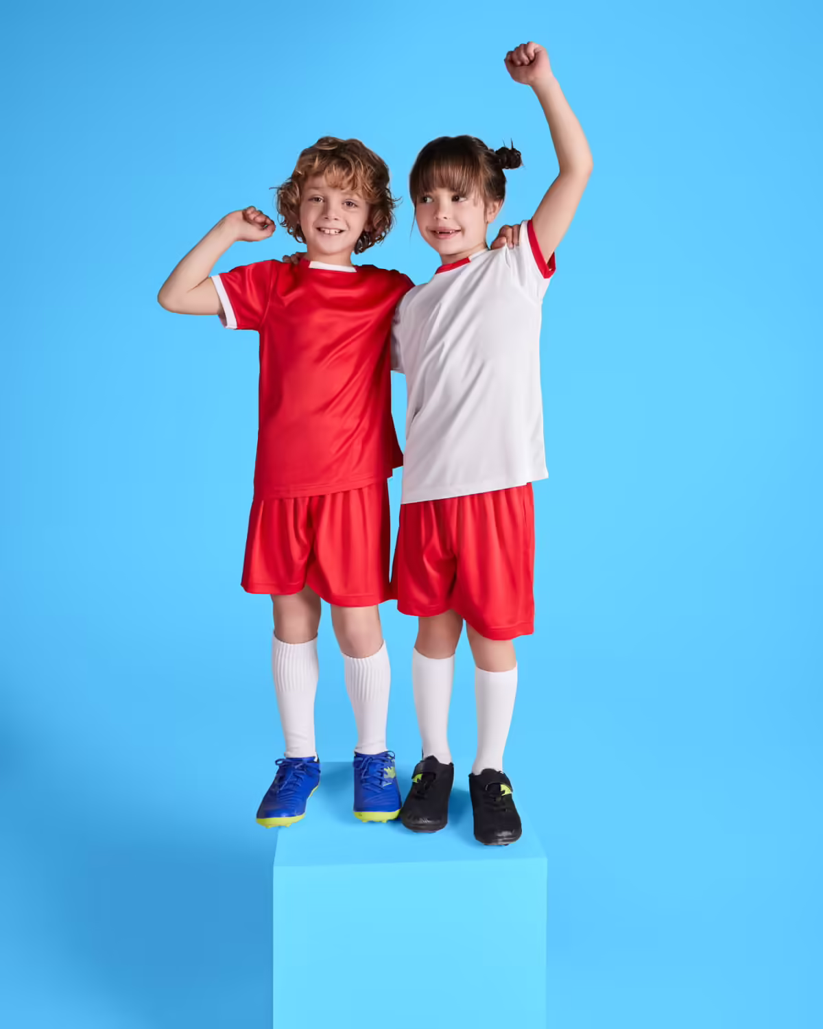 Confeccionado en 100% poliéster transpirable, el conjunto deportivo de manga corta para niño Roly Racing es ligero, es fácil de lavar, es fácil de secar, y lo más importante: mantiene al chico fresco y cómodo durante todo el partido o entreno.