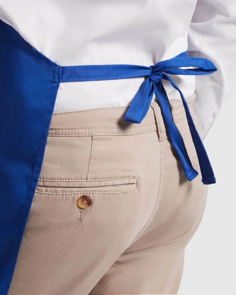 Te presentamos un delantal largo con cinta a tono en el cuello y en los laterales para la lazada.