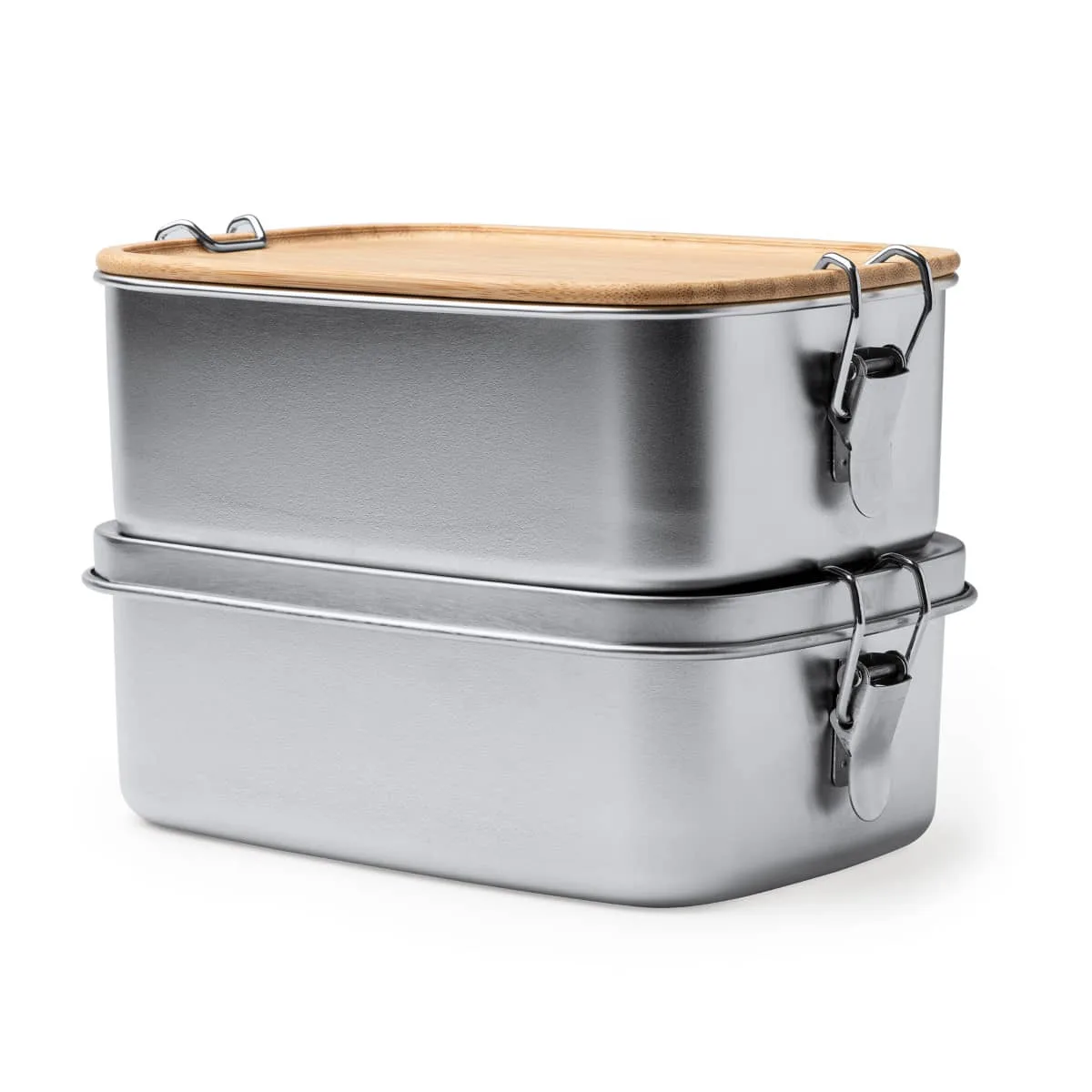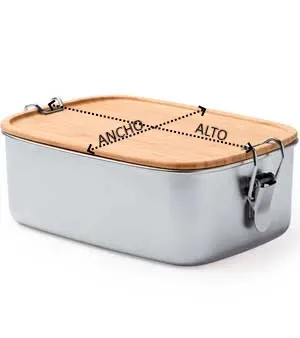 Fiambrera de acero inoxidable 304 con tapa de bambú. Sistema de cierre mediante hebillas laterales. Gran capacidad 1L para almacenar la comida.
