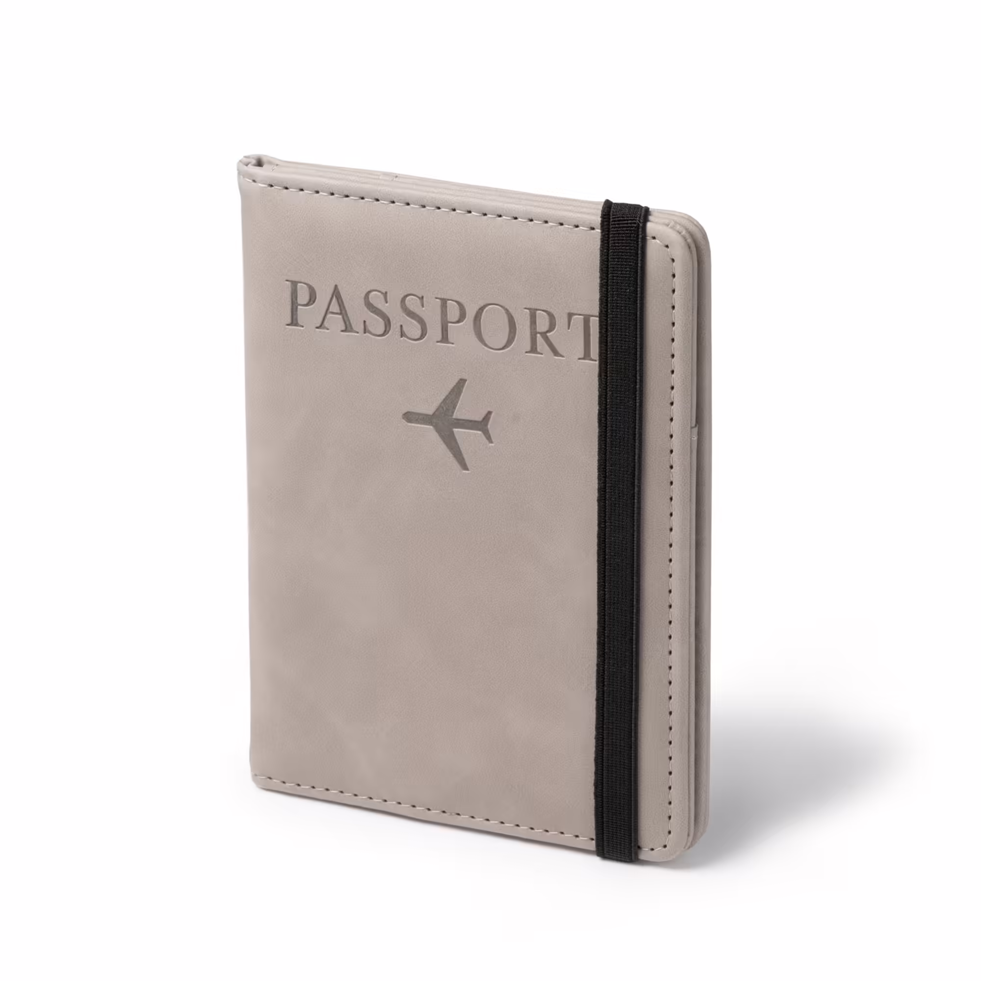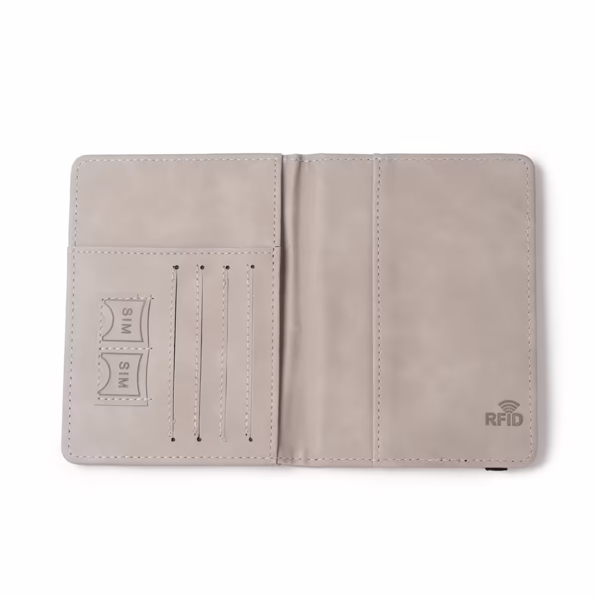 Funda para pasaporte realizada en PU Leather con banda elástica de cierre. 3 bolsillos interiores para pasaporte y documentos, 4 Bolsillos para tarjetas y 2 para tarjetas SIM.