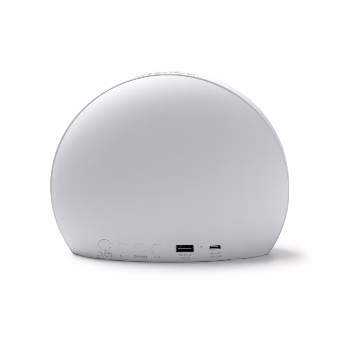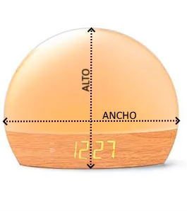 Lámpara despertador realizada en ABS reciclado con luz progresiva. Función de hora, fecha y temperatura. Cuenta con luz led en múltiples colores. Cable incluido.