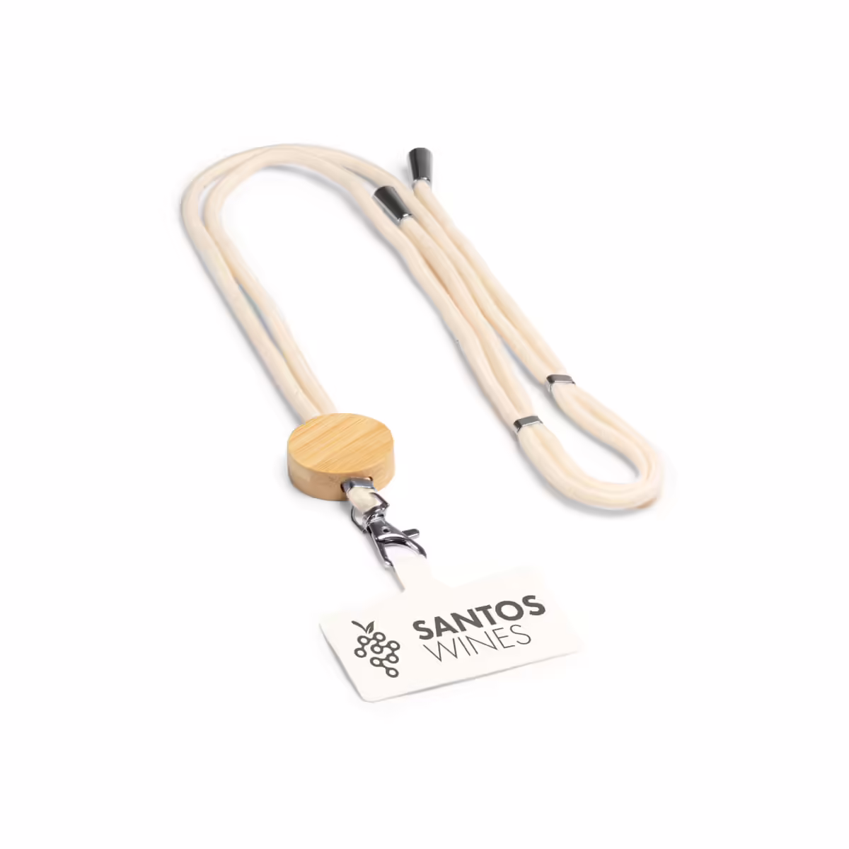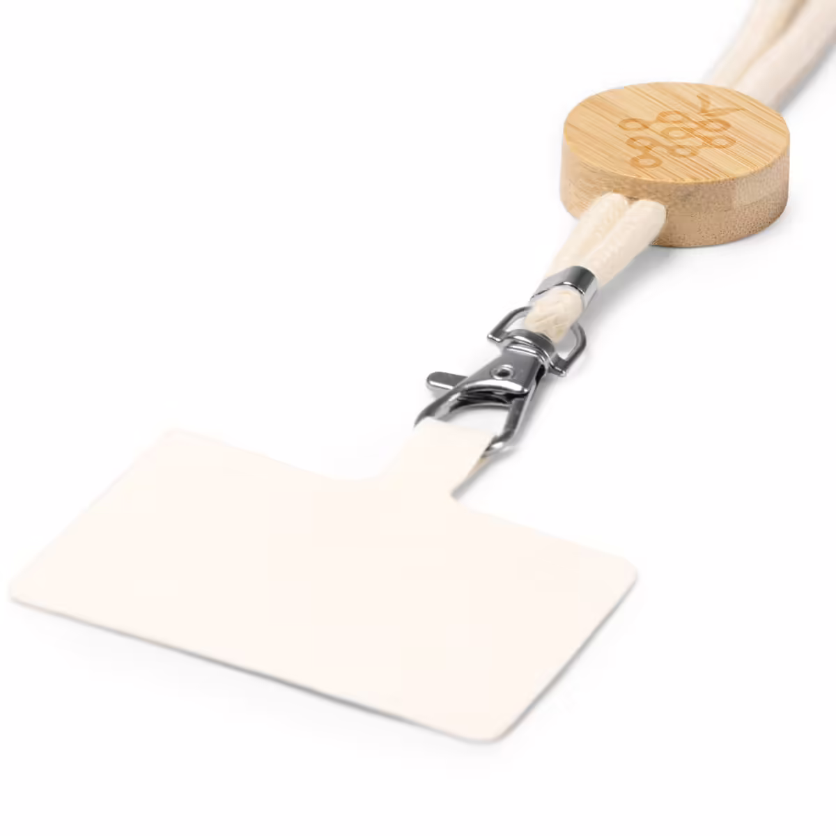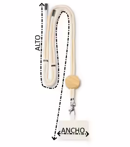 Lanyard portamóvil de algodón con detalle en bambú y sistema de ajuste.