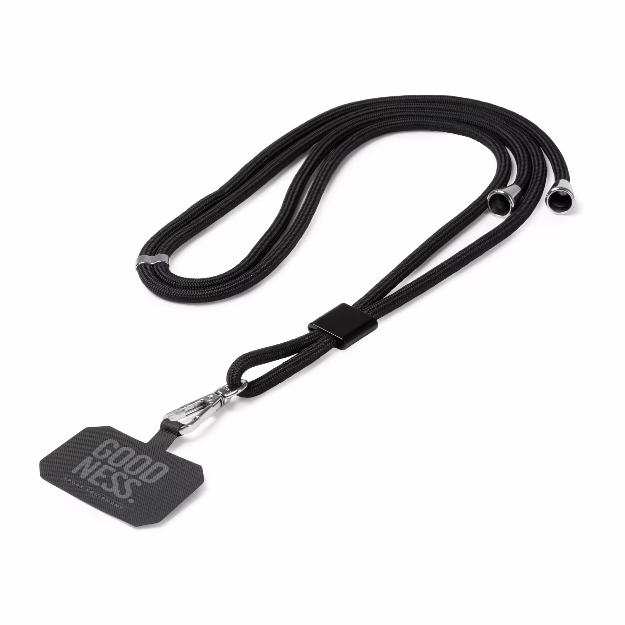 Lanyard portamóvil de poliéster reciclado RPET. Cinta ajustable e incluye mosquetón.