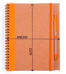 Libreta con espiral y tapa rígida de cartón reciclado. Incluye bolígrafo a juego con tinta azul. 60 hojas.