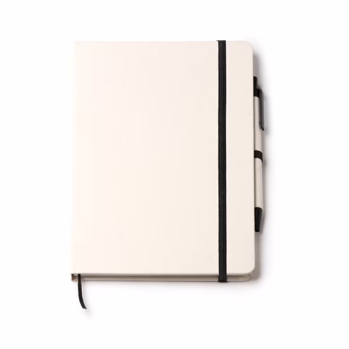 Bloc de notas A5 realizado en cartón reciclado de brics de leche. Tapa rigida con banda elástica y marca páginas. Incluye bolígrafo de tinta azul. 100 hojas a rayas.