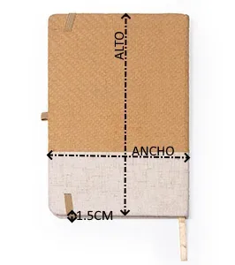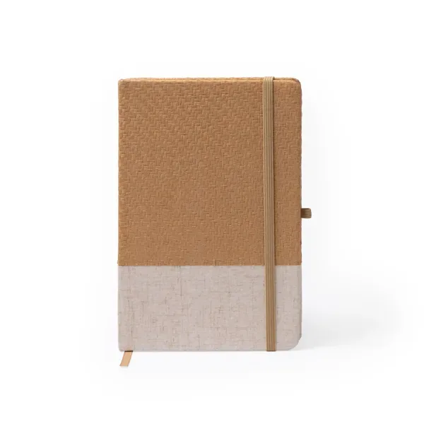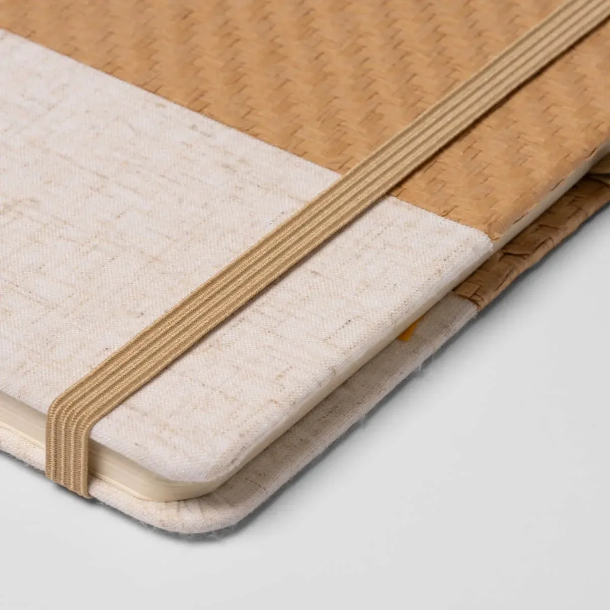 Bloc de notas A5 con tapa rígida de paja natural y algodón. Marcapáginas y banda elástica a tono. 80 hojas a una linea.