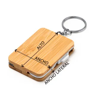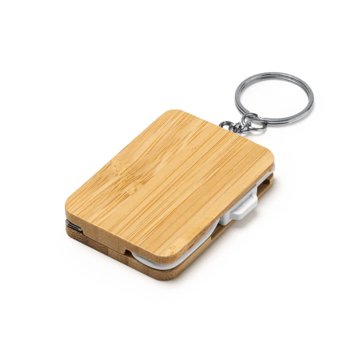 Llavero con cable cargador 3 en 1. Realizado en cuerpo de bambú. Con conexiones Micro USB, Tipo C y lightning. Cable cargador con amplia zona para marcaje.
