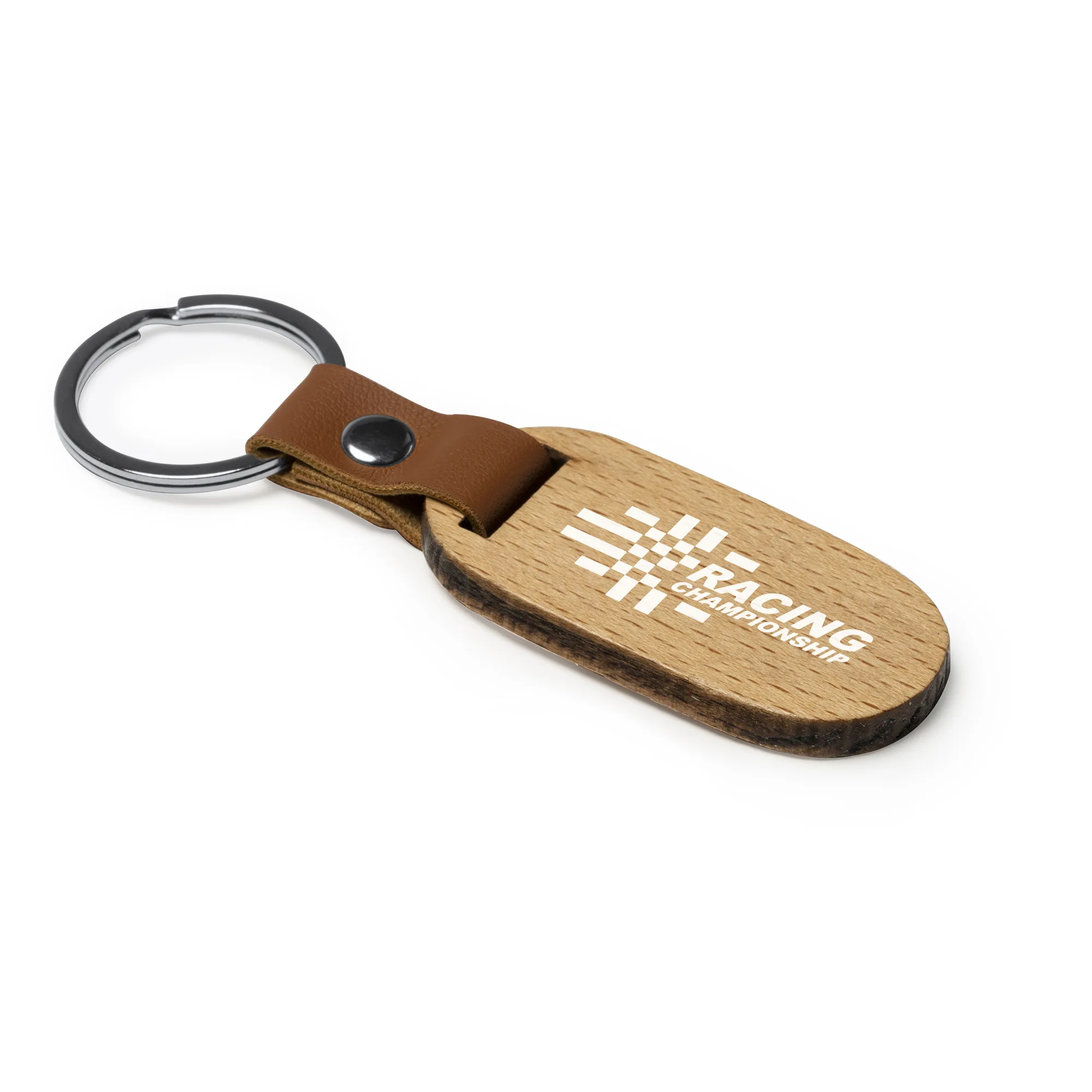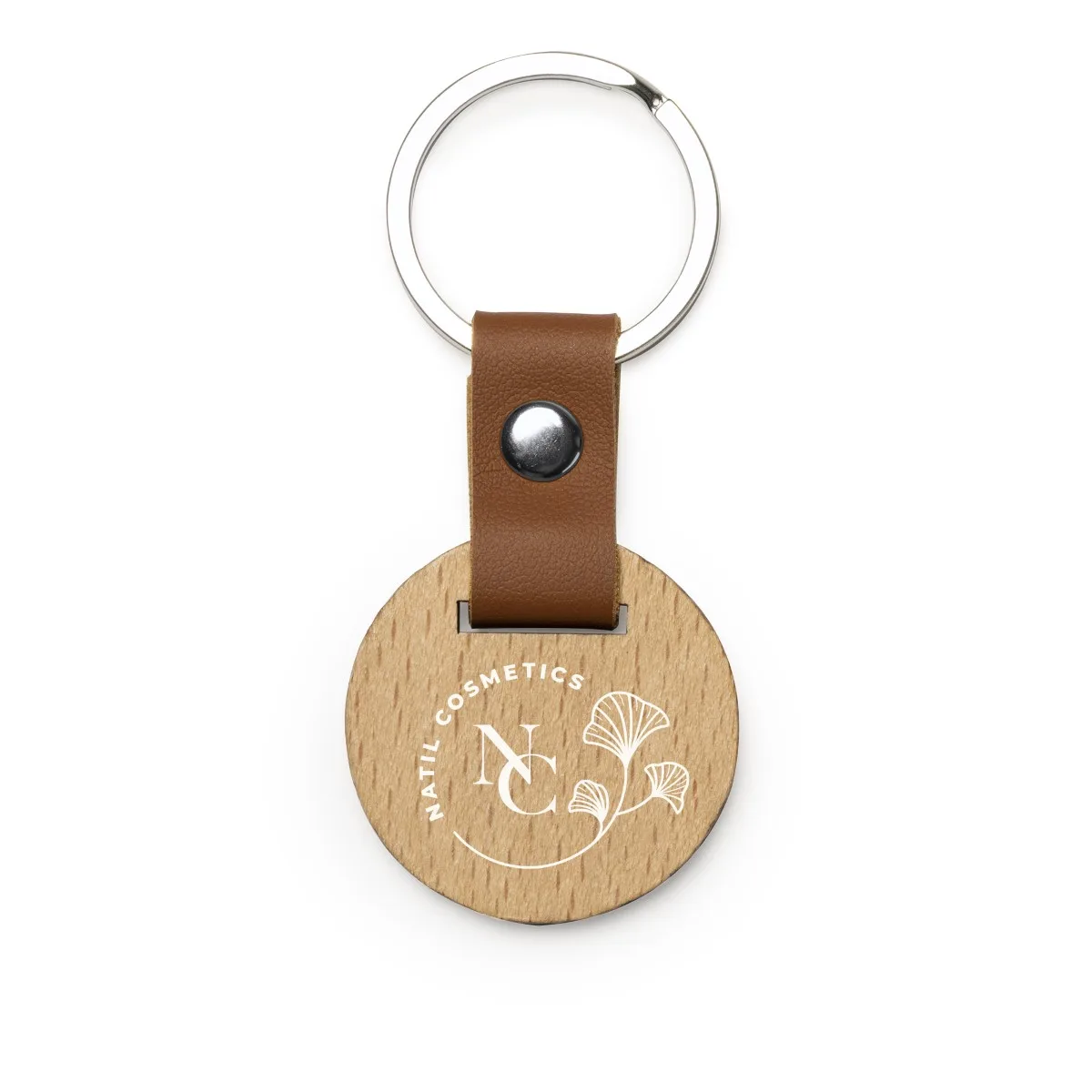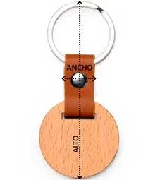Llavero de madera natural en dos formatos con terminaciones en elegante polipiel.