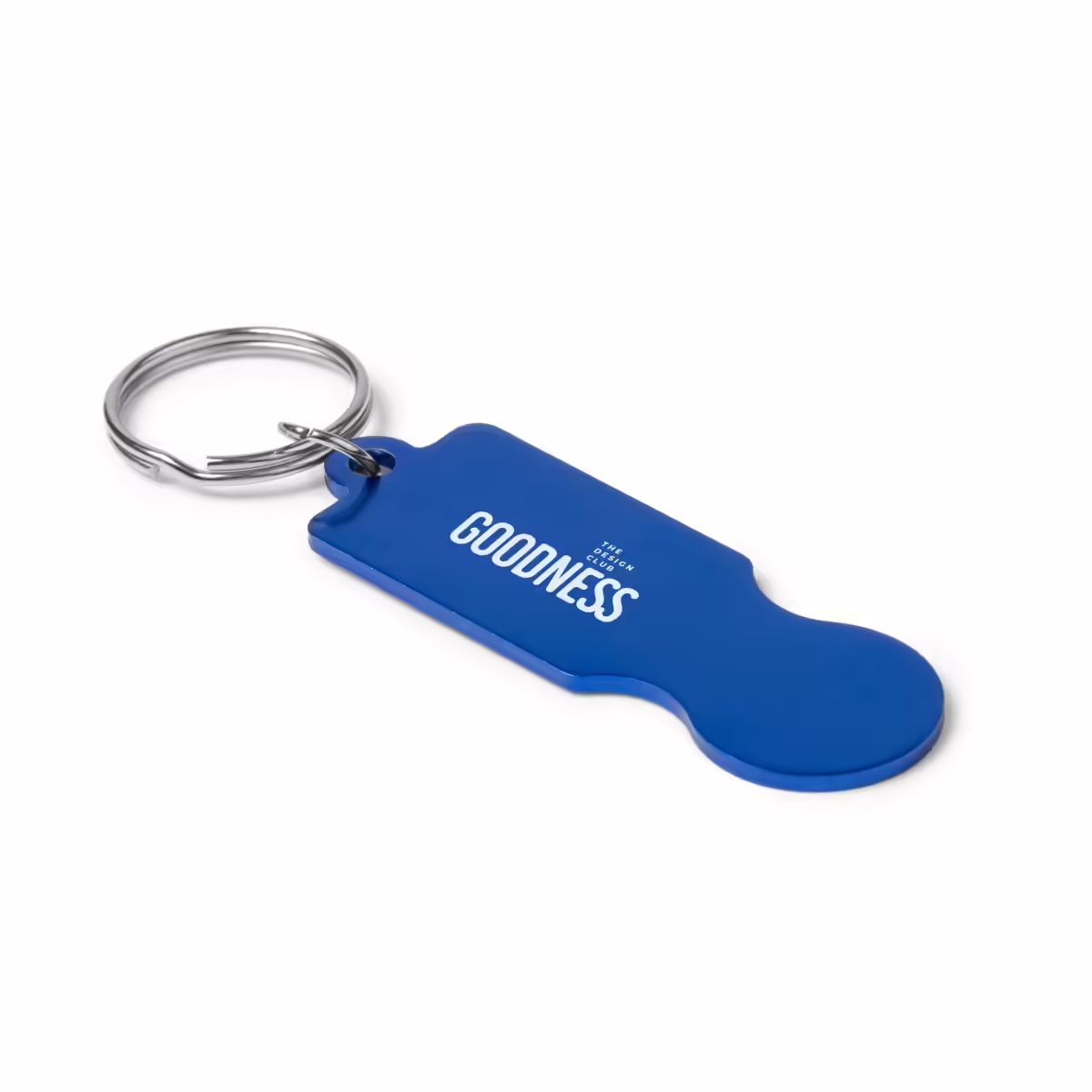 Llavero de aluminio reciclado con moneda para el carro de la compra. Amplia zona de marcaje.