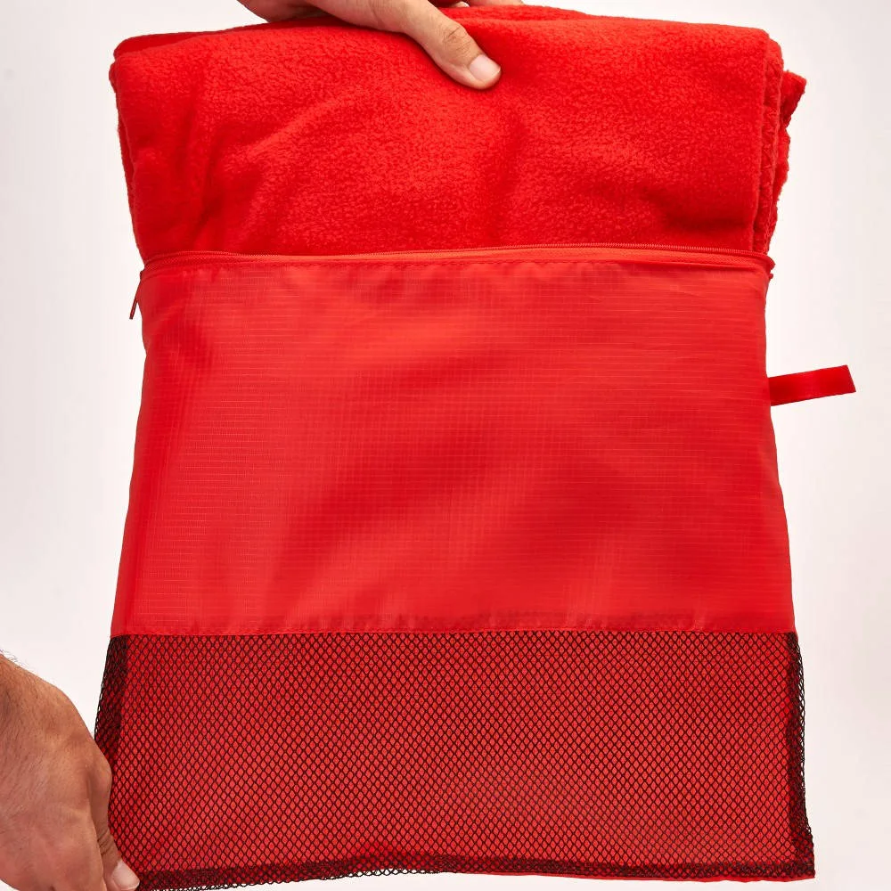 Manta de forro polar de 200gsm en color liso con funda a juego. Tratamiento anti-pilling en uno de los lados. Funda rectangular realizada en poliéster tela Oxford y rejilla, con cremallera del mismo color.