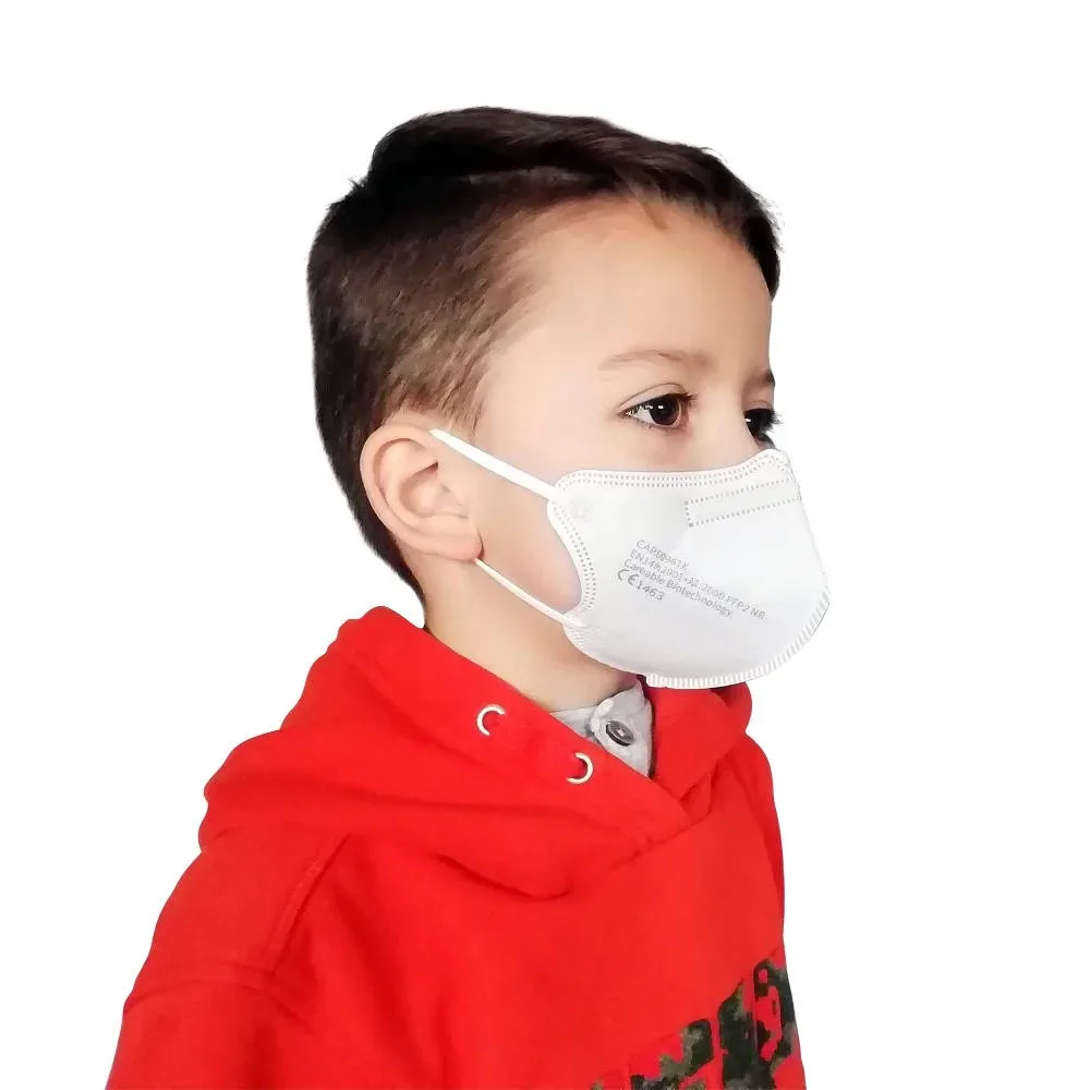 Mascarilla INFANTIL de seguridad FFP2 NR de cinco capas. Acabados termosellados, con elásticos de sujeción y pinza ajustable en la nariz.