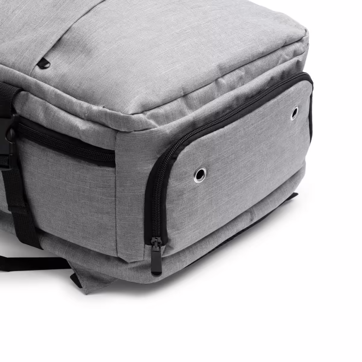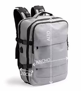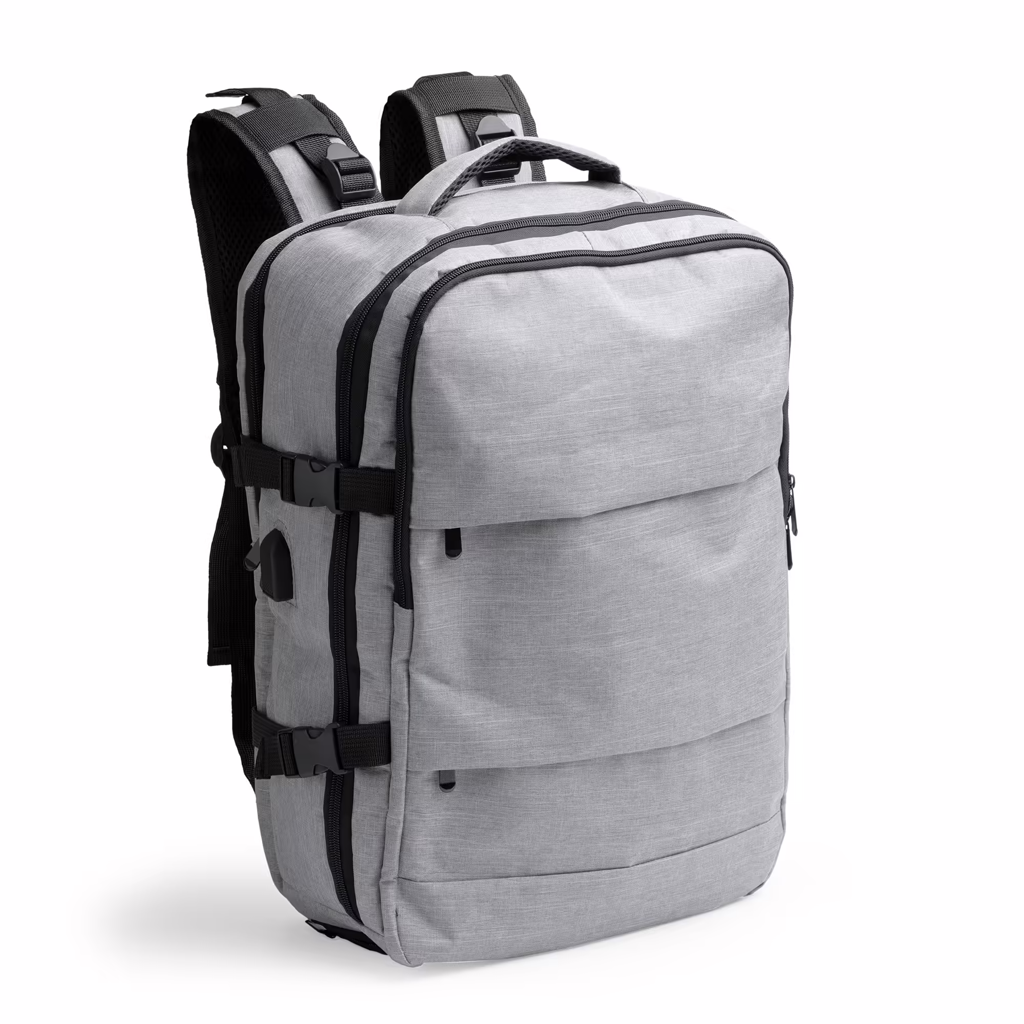 Mochila de viaje realziada en poliéster reciclado RPET, diseñada para comodidad y funcionalidad. Cuenta con espalda y asas acolchadas, 2 bolsillos exteriores frontales y 3 amplios compartimentos principales. Incluye un compartimento acolchado para portátil de 17,3″, salida USB con cable micro USB para conectar un Power Bank (no incluido), y un compartimento transpirable para zapatillas. Con bolsillo antirrobo en la parte trasera y cinta para trolley, ofrece una capacidad de 30 litros para viajes organizados y seguros.