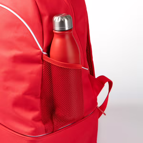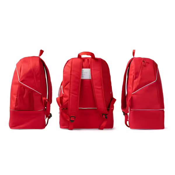 Mochila deportiva con cajón zapatillero rígido. Compartimento principal con cremallera y doble tirador. Bolsillo interior en tejido de forro con cremallera. Espalda y asas acolchadas. Tarjetero de plástico para información. Capacidad de 35L.