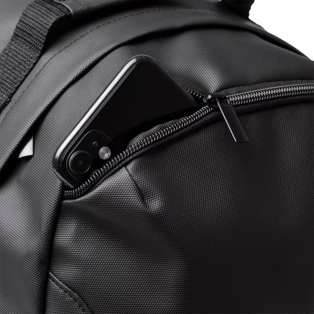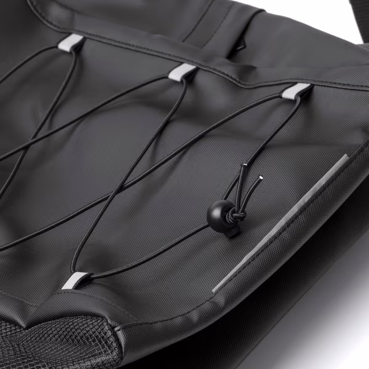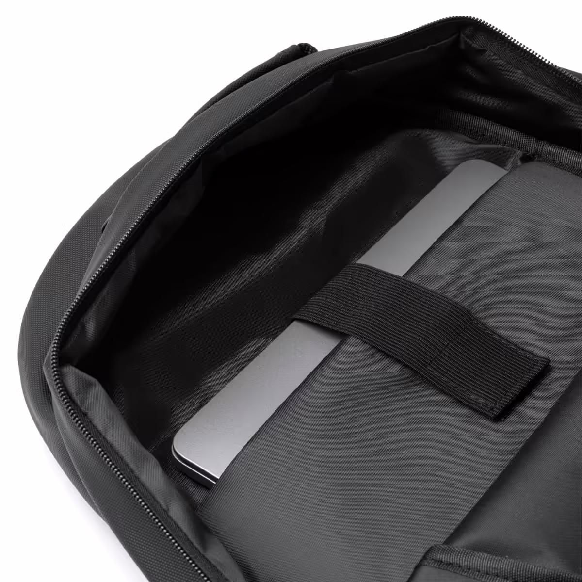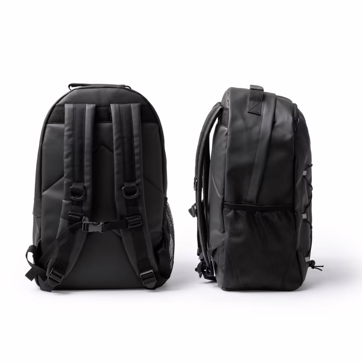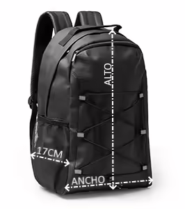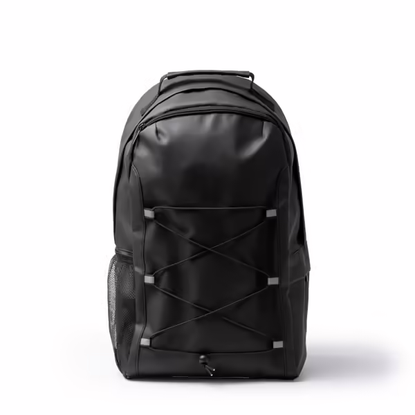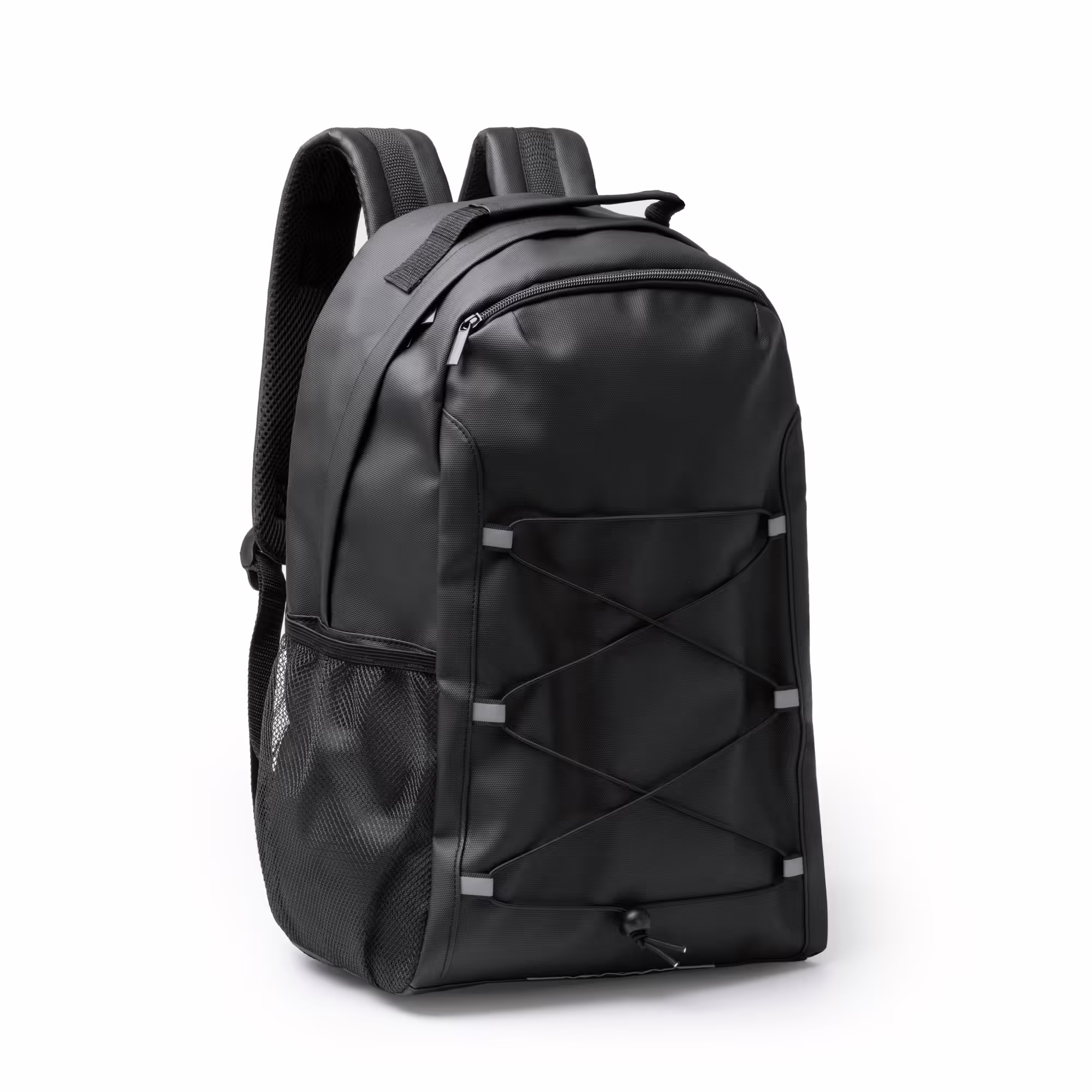 Mochila realizada en PU Leather con detalles reflectantes. Compartimento principal de gran capacidad con bolsillo interior para portátil de 17". Frontal con cuerdas elásticas y bolsillo lateral. Asas con ajustador. Espalda y asas acolchadas. Capacidad de 20L.