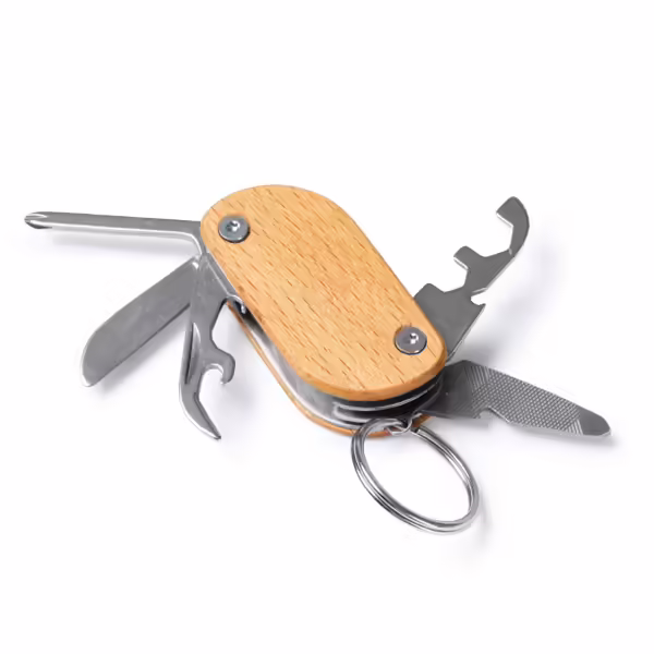 Multiherramientas con cuerpo de madera y accesorios de acero inoxidable. 5 funciones: lima, navaja, abridor, abre latas y destornillador.