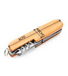 Navaja multiusos con accesorios en acero inoxidable y cuerpo de bambú. 9 funciones. Incluye cinta para transporte en polipiel.