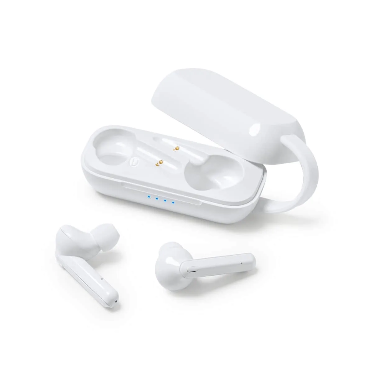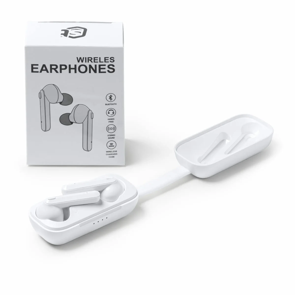 Auriculares inalámbricos Bluetooth 5.0 con estuche de carga. Botón multifunción integrado en ambos auriculares. Función manos libres. Batería recargable mediante tecnología inalámbrica. Cable incluido. Presentación en caja diseño.