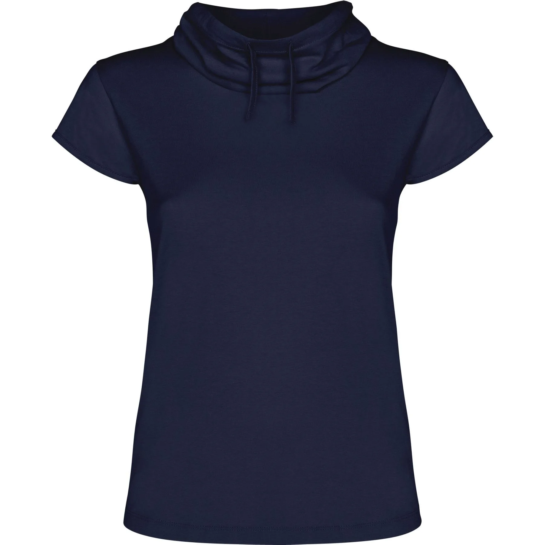 Camiseta manga corta, escote amplio de base y cuello chimenea con ajuste de cordón. Costuras laterales y talle con forma.