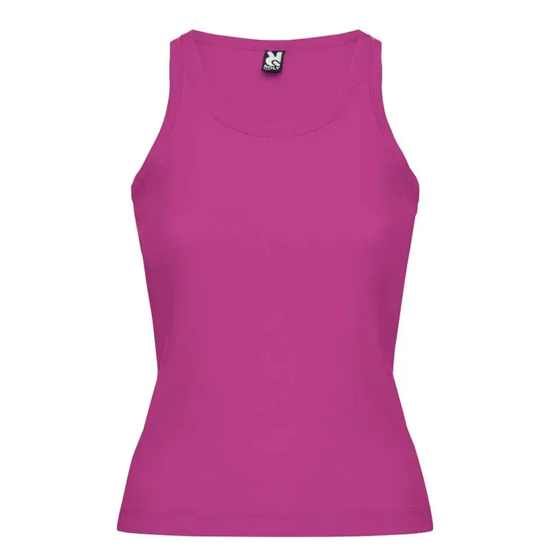 Camiseta de tirantes entallada, de sisas y escote ribeteado ancho y enrollado. Costuras laterales. 100% algodón, canalé 1×1, 220 g/m²