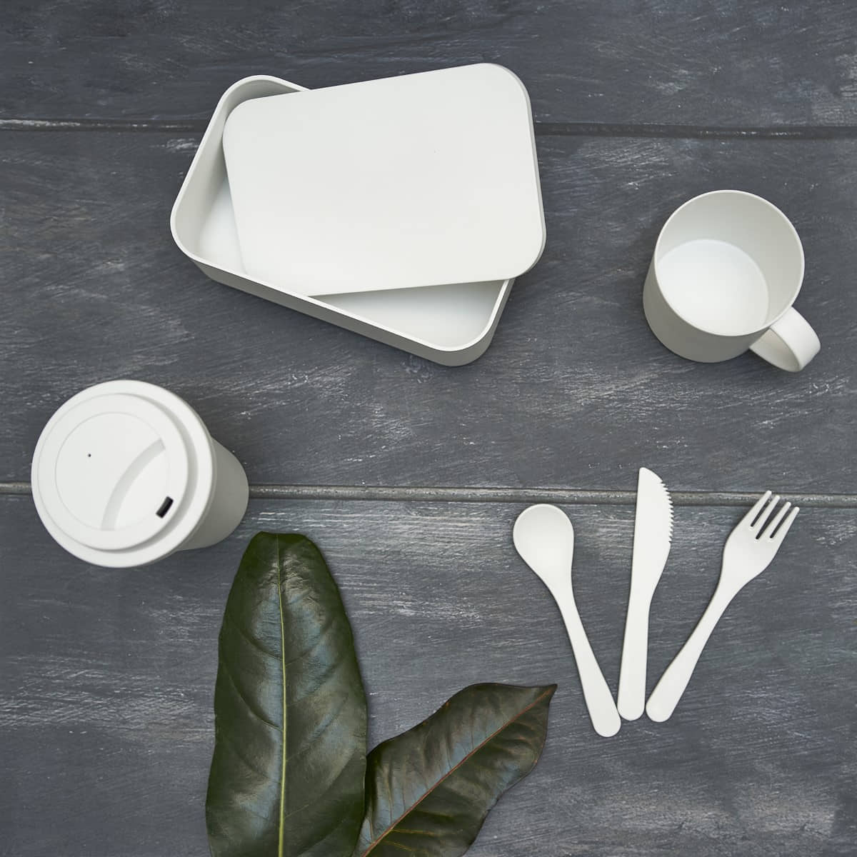 Fiambrera realizada en PLA con cinta de ajuste en silicona. Incluye Tenedor, cuchara y cuchillo. Capacidad 1 L. Disfruta de la comida en cualquier lugar.