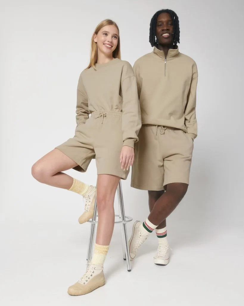EL PANTALÓN CORTO DE DEPORTE UNISEX Cintura elástica en el tejido principal Cordón redondo en el mismo tono rematado con extremos de acabado metálico Ojales bordados Forro interior de bolsillo en punto de jersey Bolsillo plastrón trasero Pespunte sencillo en cintura, abertura de los bolsillos y laterales Pespunte doble en bajo y entrepierna