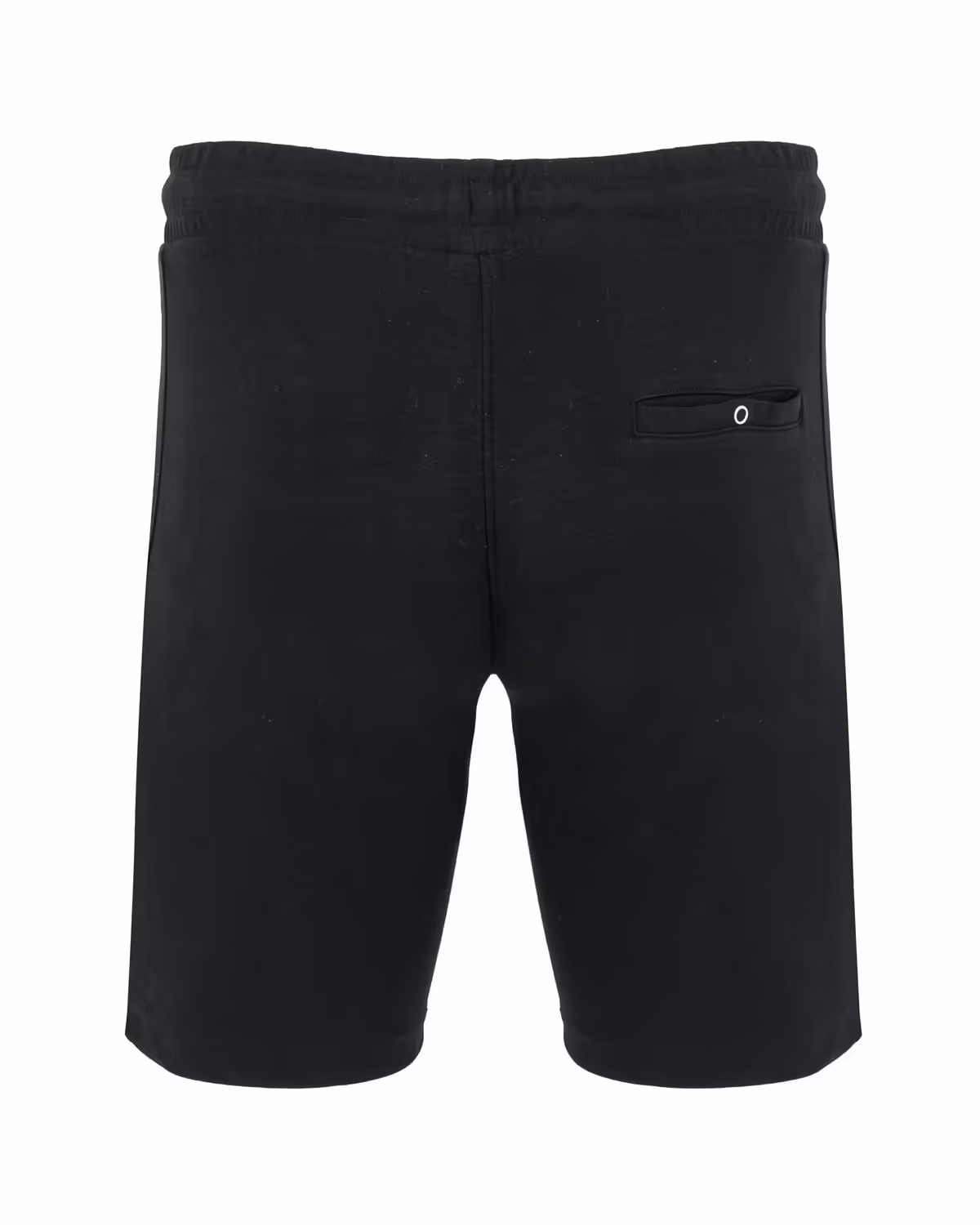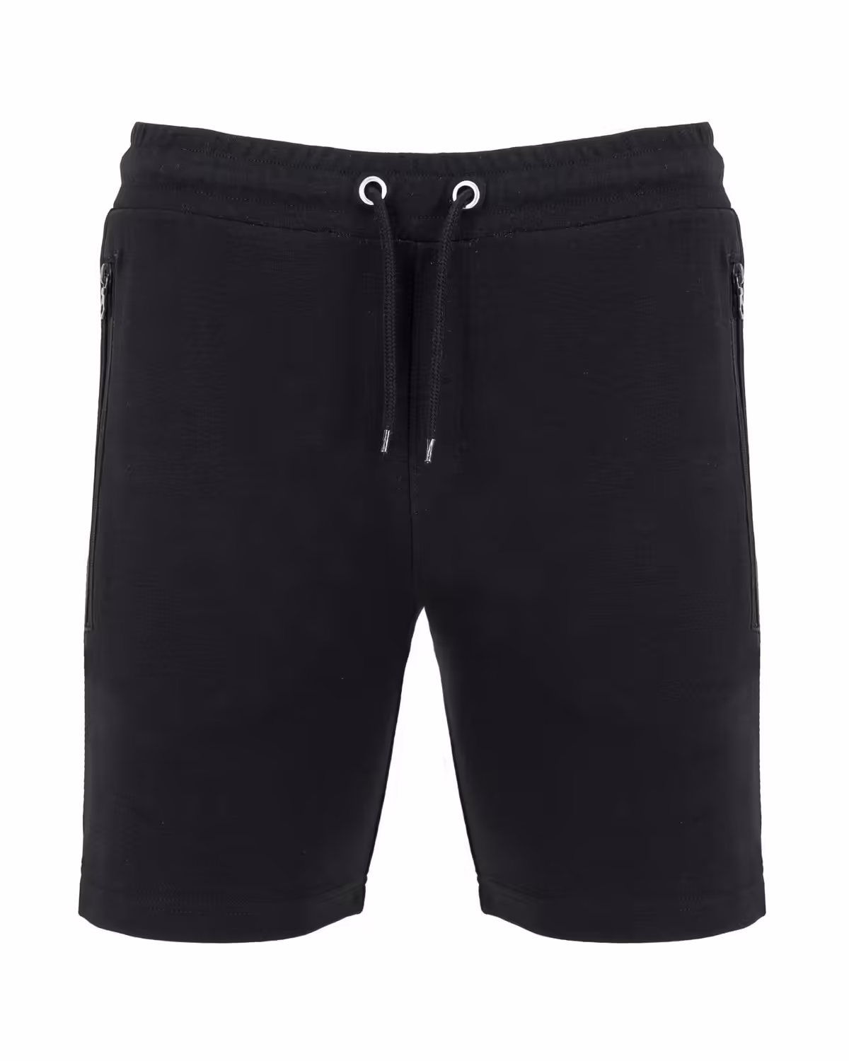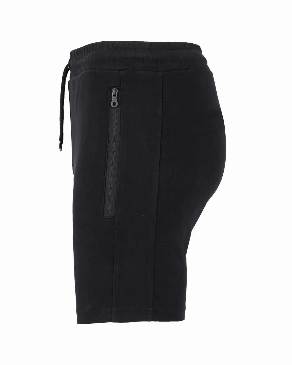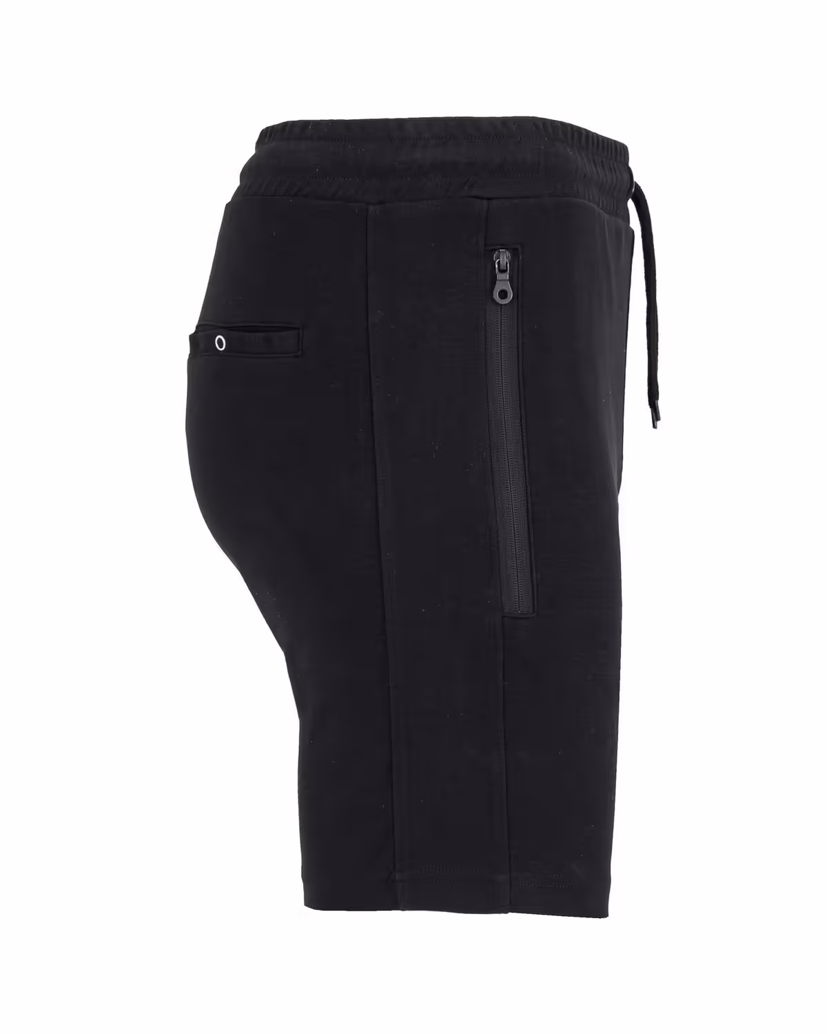 Pantalón corto con cinturilla elástica y cordón con ojales metálicos. Dos Bolsillos laterales con cremalleras invertida a tono y tirador. Banda lateral a tono. Adorno de bragueta cosida. Un bolsillo trasero con broche de presión.