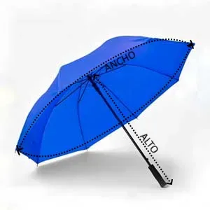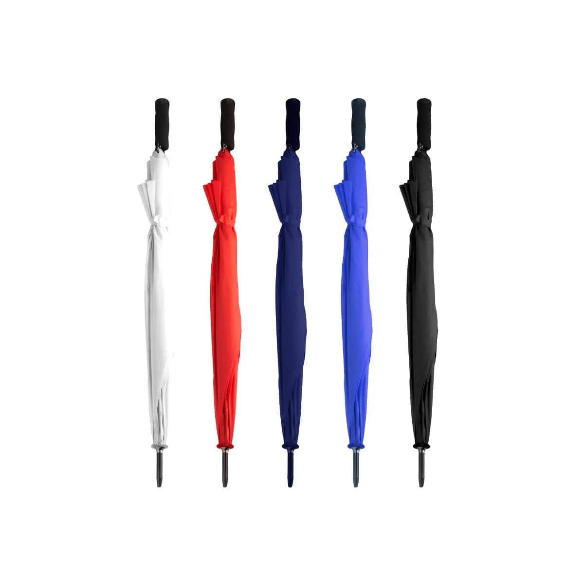 Paraguas XL con mango, bastón y terminaciones en negro. Varillas largas de fibra de vidrio. Botón de apertura automática. Mango recto de goma EVA. Cierre con velcro en color a juego con la tela del paraguas.