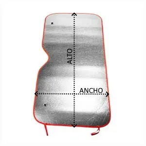 Parasol para coche con 2 capas de burbujas exteriores en aluminio. Dos orificios en ambas esquinas superiores para la introducción de ventosas de sujeción a la luna del vehículo. Ribete y gomas elásticas para su enrollado en color. Presentación en plano. Venta por caja completa.