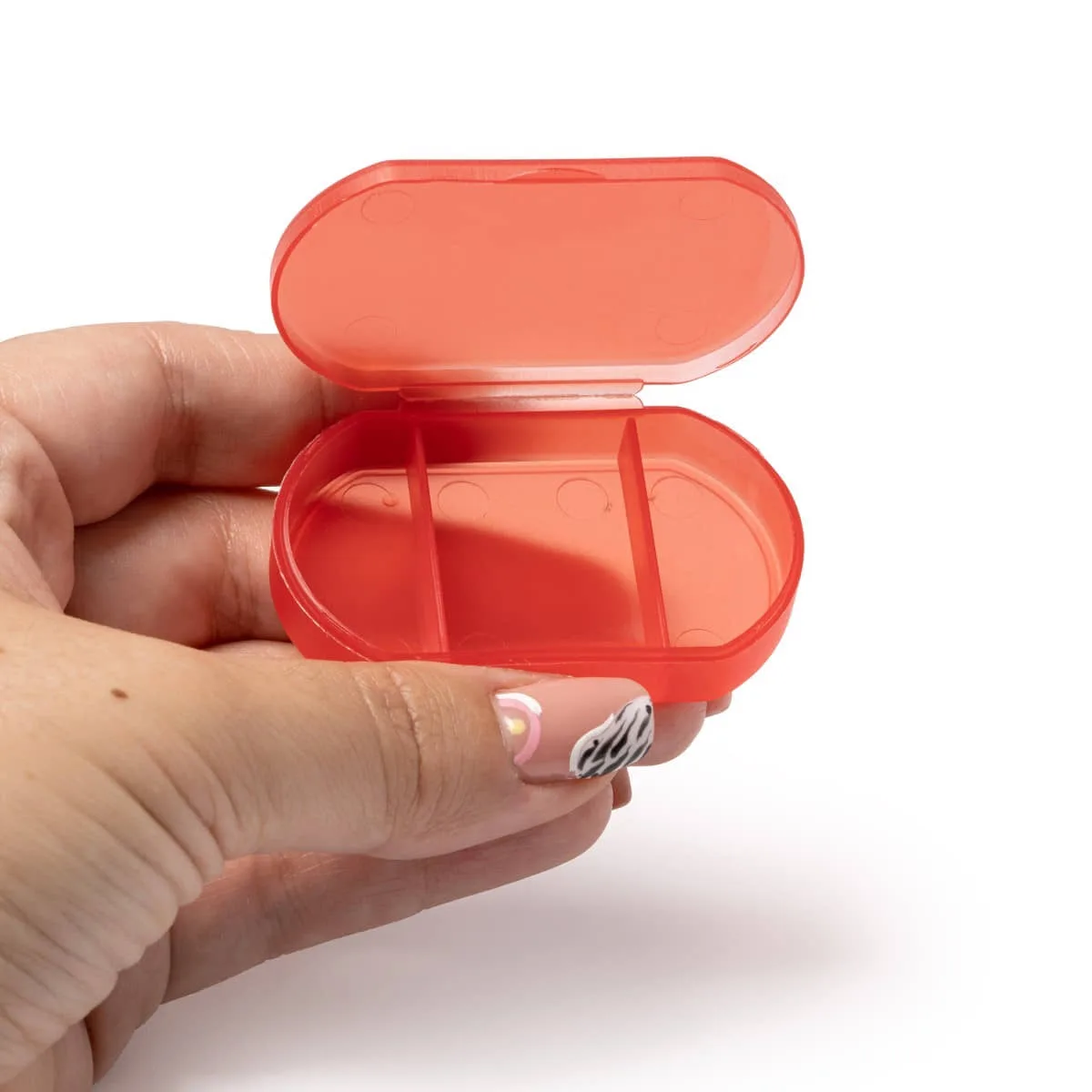 Ligero pastillero con tres compartimentos. Diseño en colorido acabado traslúcido.