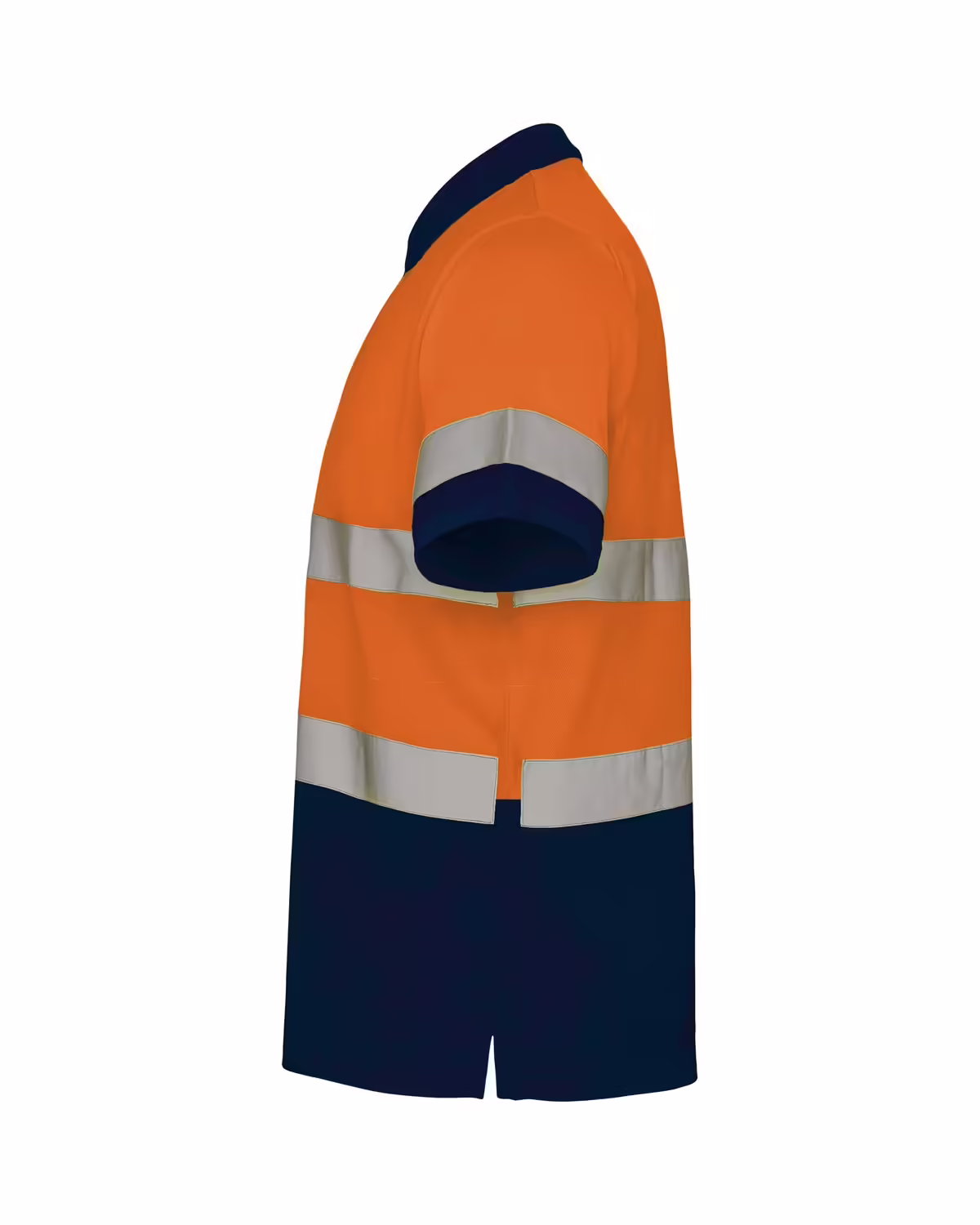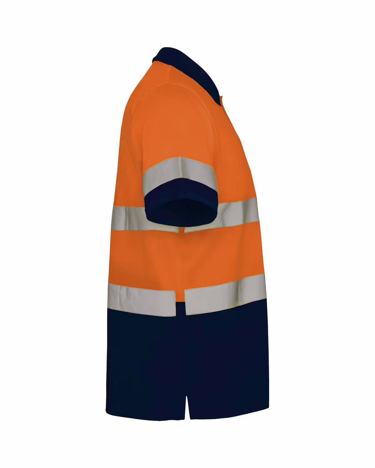Polo técnico de alta visibilidad con tapeta a tres botones, dos cintas reflectantes en cuerpo y una en mangas.