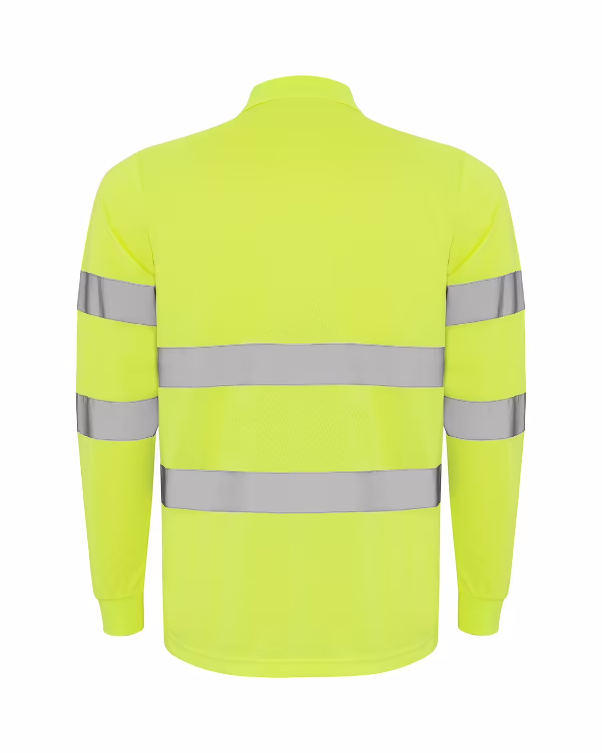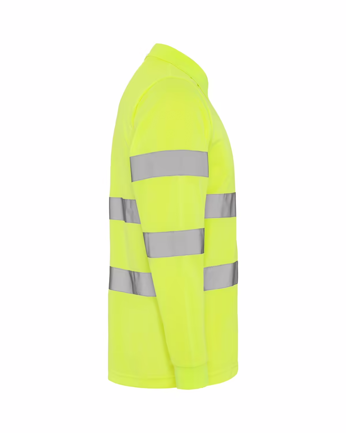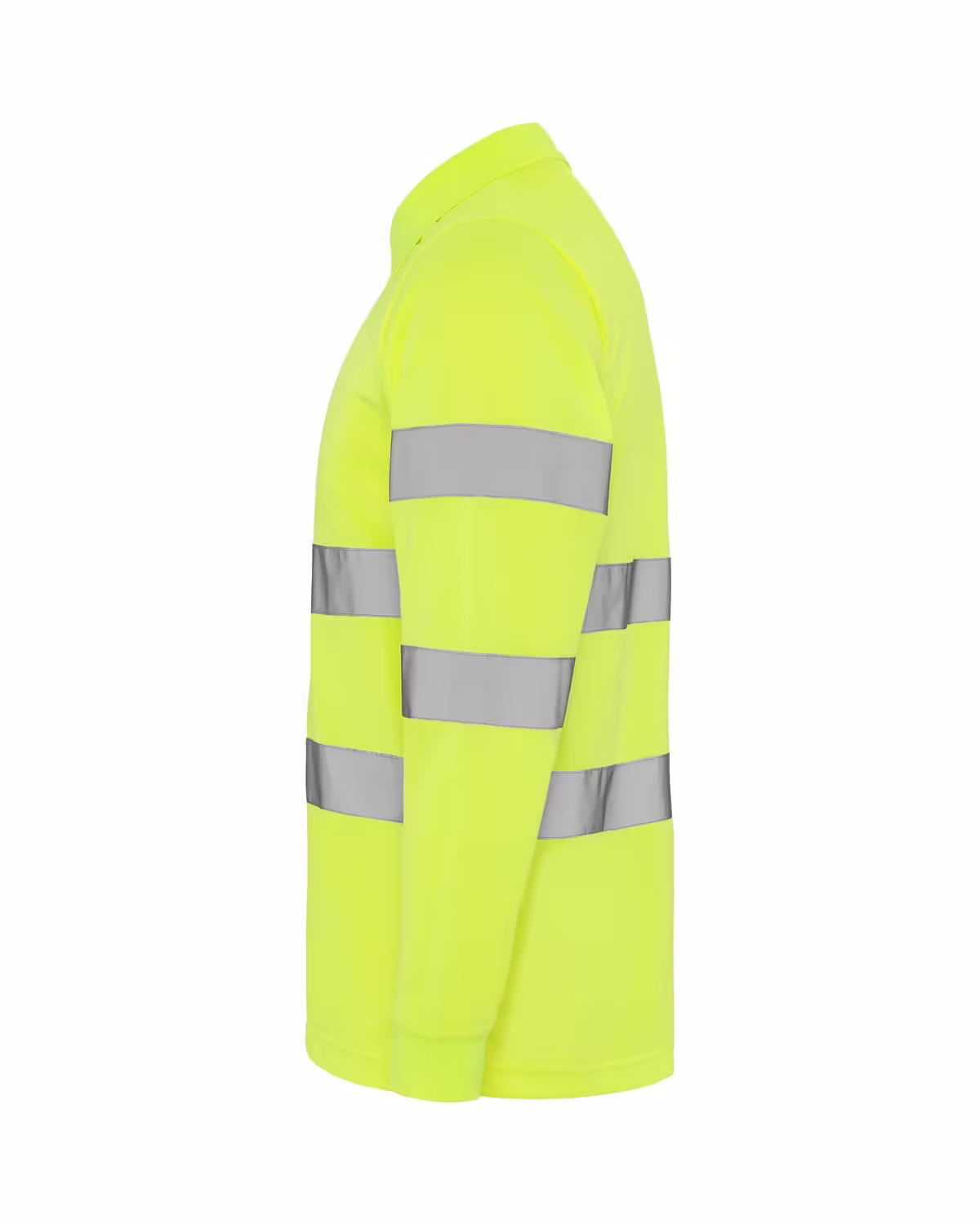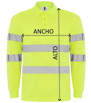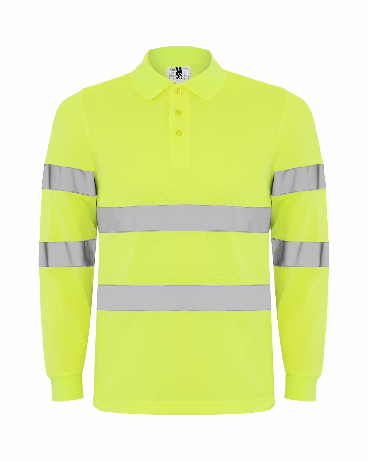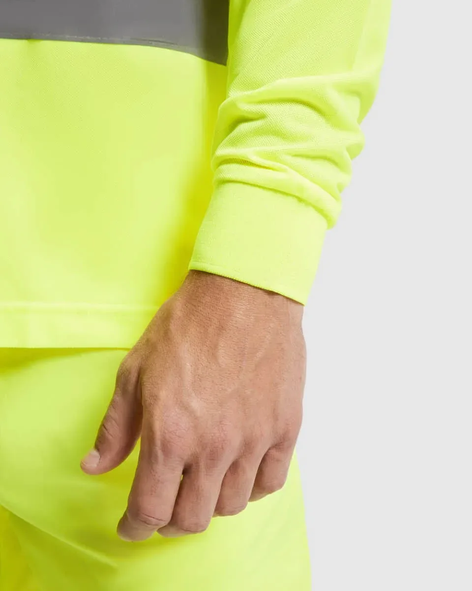 Polo técnico manga larga de alta visibilidad. Tapeta a 3 botones, cuello y puños en punto canalé 1×1, dos bandas reflectantes horizontales en torso y mangas, bolsillo opcional.