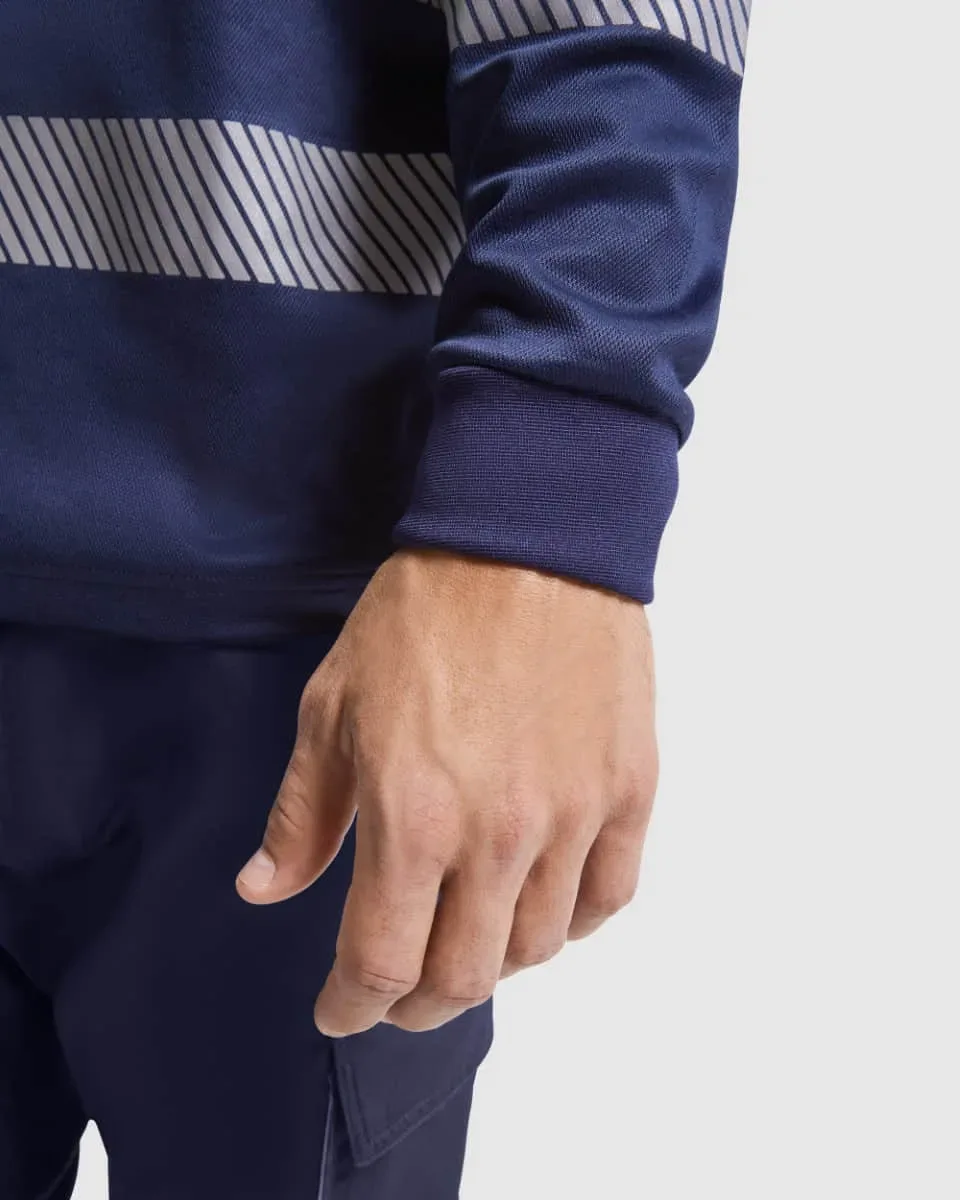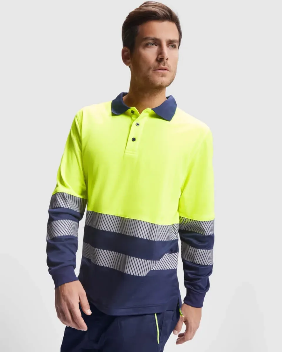 Polo técnico de alta visibilidad para hombre en manga larga con cuello en punto canalé 1×1. Tapeta con 3 botones a contraste. Dos bandas reflectantes segmentadas en torso y mangas. Tejido mezcla poliéster y algodón para mayor comodidad y transpirabilidad. Bolsillo opcional.