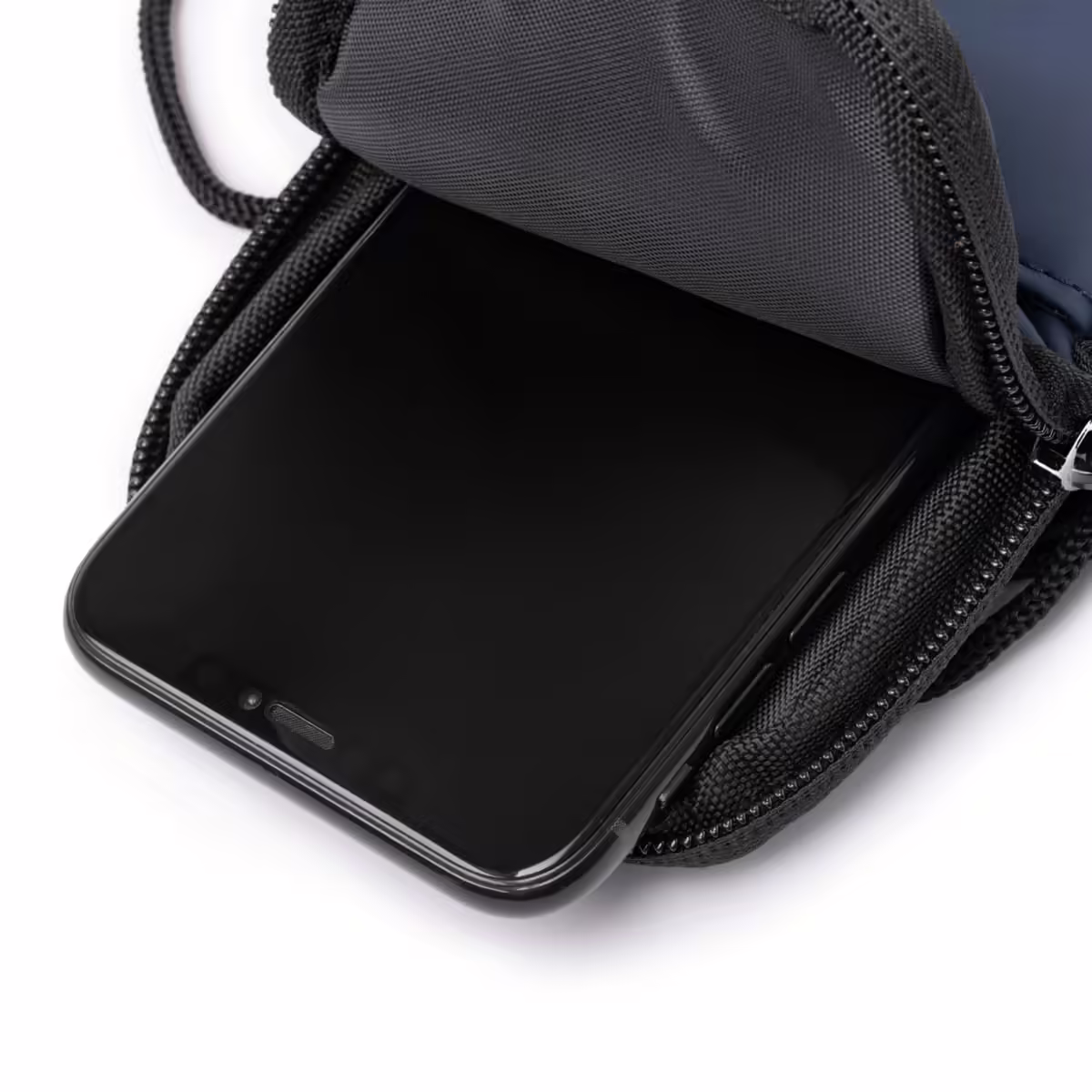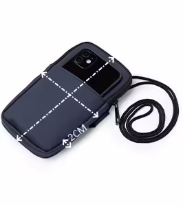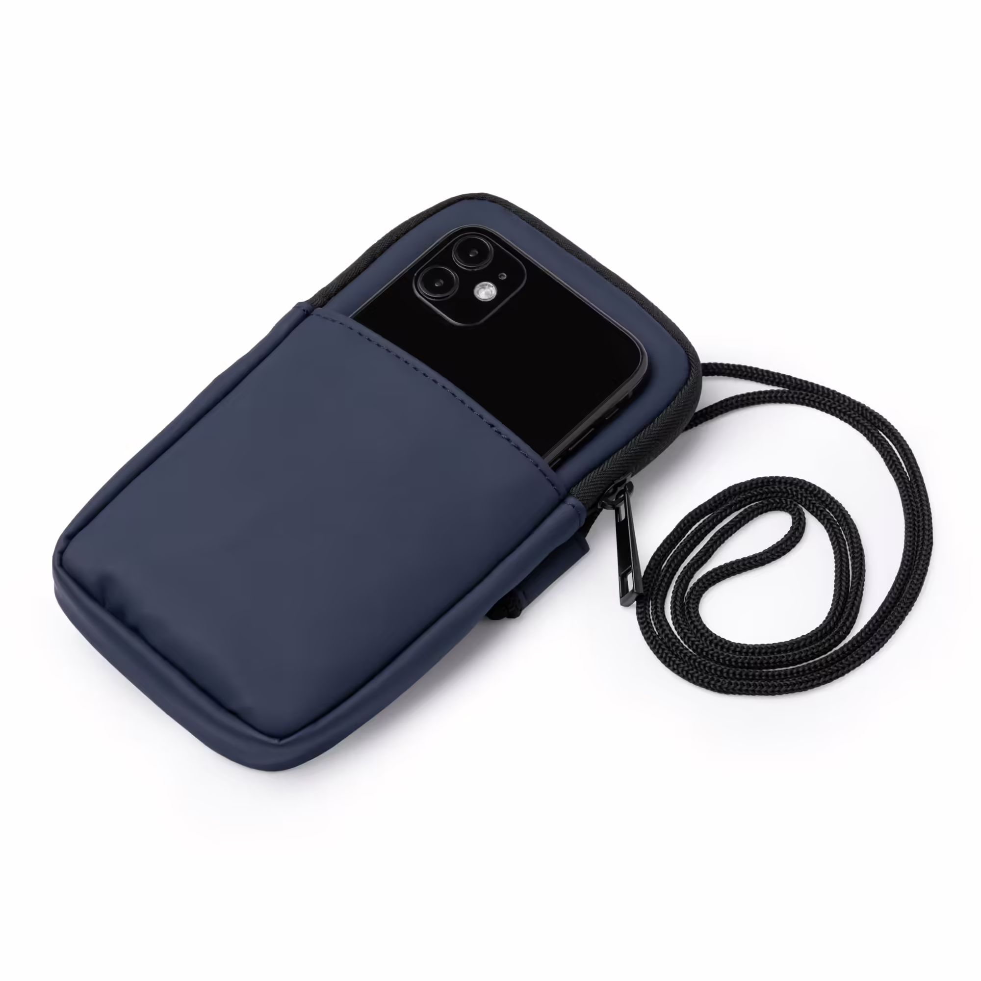 Portamóvil realizado en PU Leather. Compartimento principal con cierre de cremallera. Bolsillo exterior y cinta de transporte ajustable.