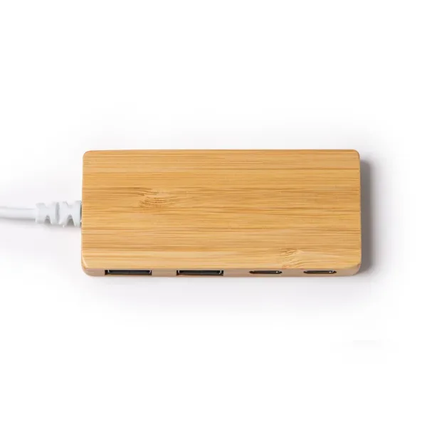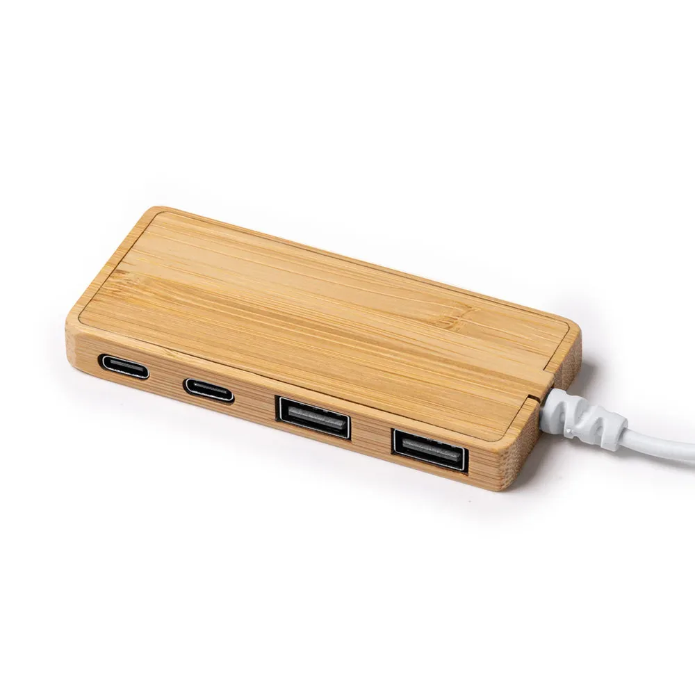 Puerto USB realizado en bambú. Conexión de entrada Tipo C. Dos salidas USB y dos salidas Tipo C.