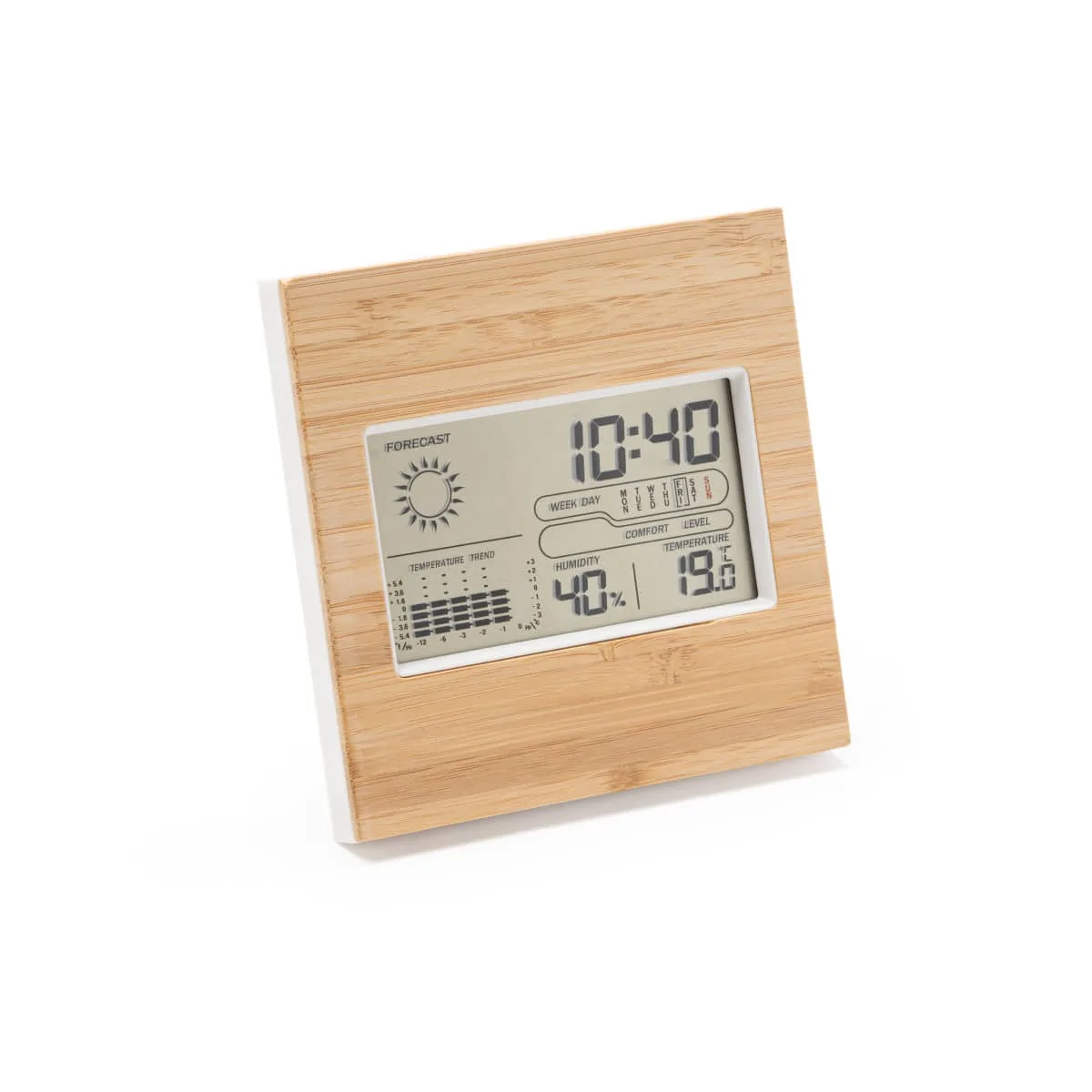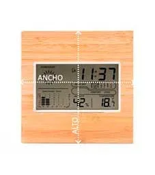 Estación meteorológica con carcasa frontal de bambú. Función reloj, calendario y alarma con sensores de temperatura y humedad.