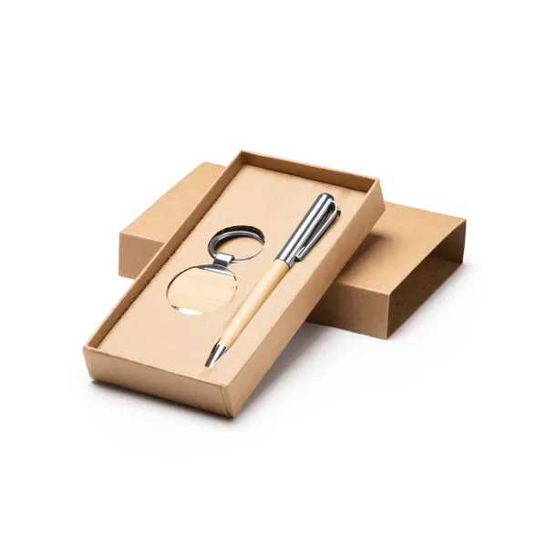 Set de bolígrafo y llavero de bambú con detalles metálicos. Tinta azul.