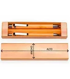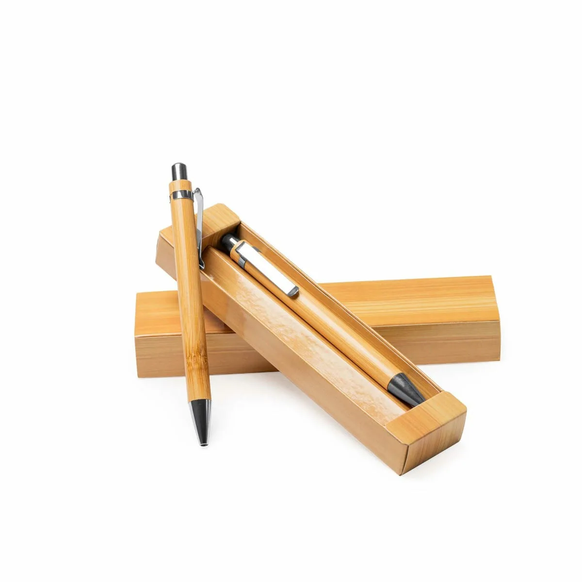 Set Bolígrafo y Portaminas de bambú. Mecanismo pulsador. Tinta azul. Presentado en caja de cartón efecto madera.