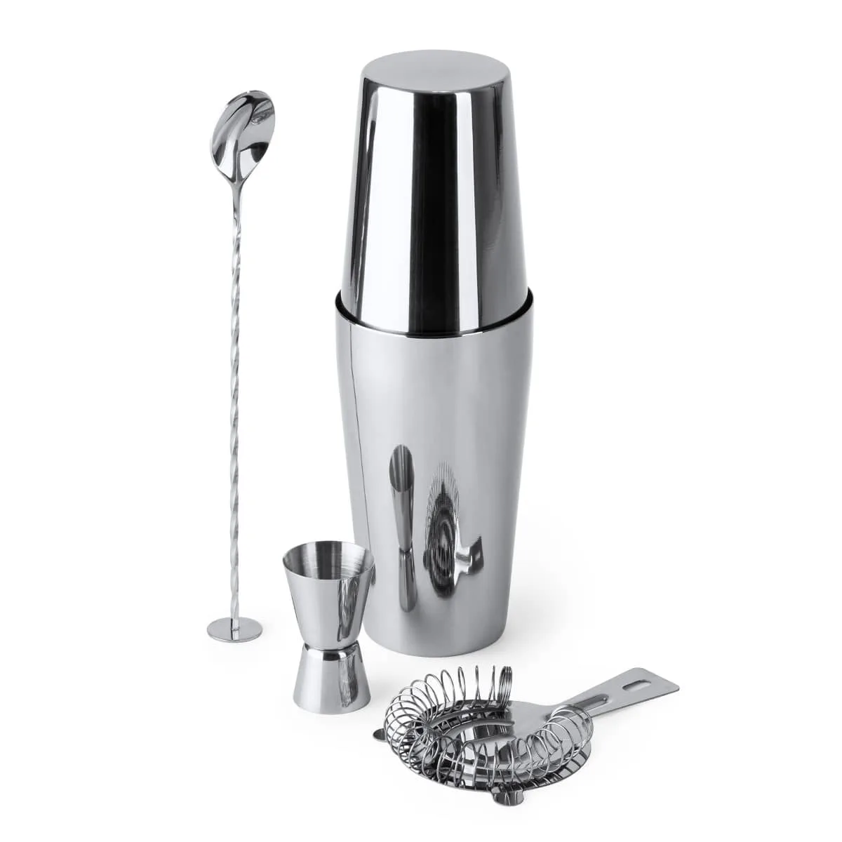 Set de cóctel en acero inoxidable 304. Incluye vaso medidor, coctelera de 580 ml, colador y cuchara. Bolsa de transporte incluida.