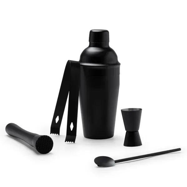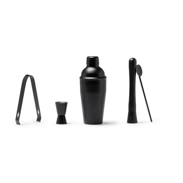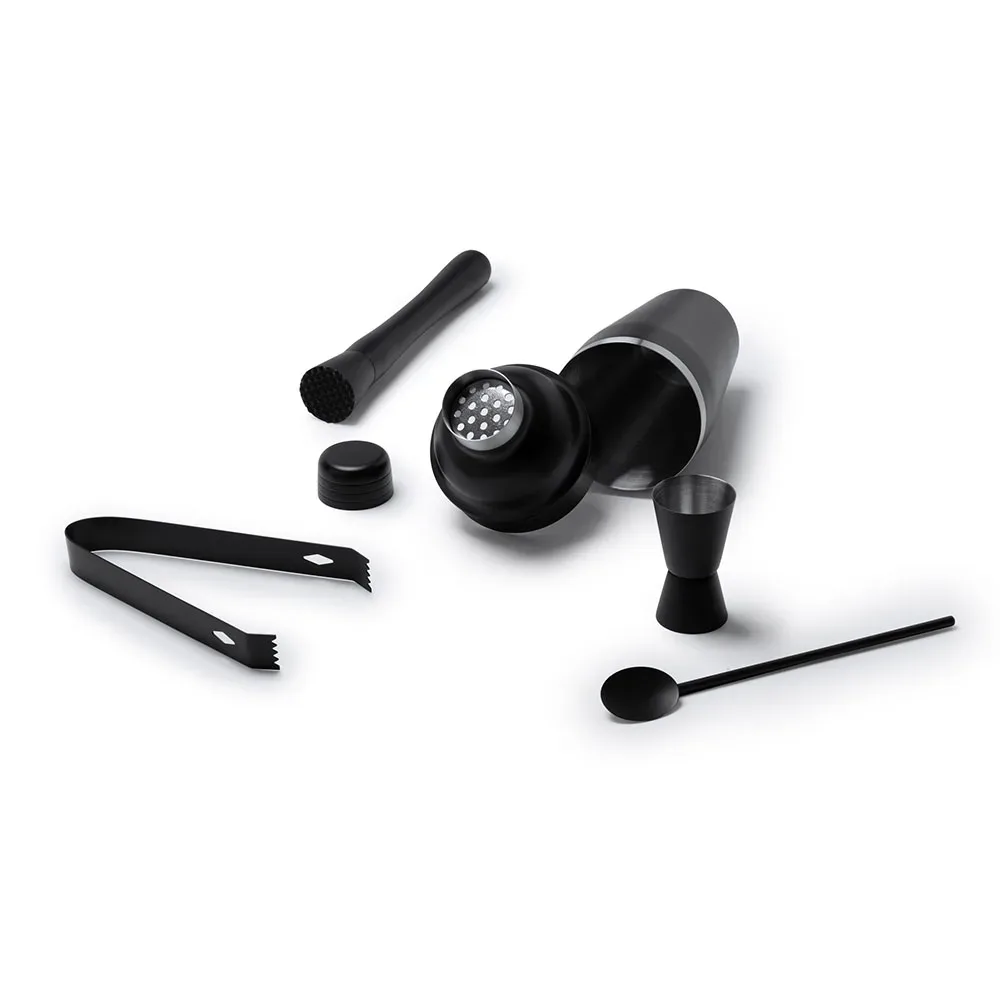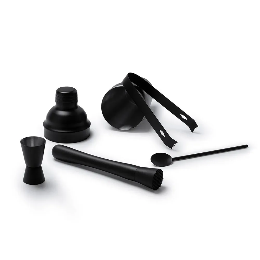 Set de cóctel de acero inoxidable 304. Incluye vaso medidor, coctelera de 550 ml, pinzas, cuchara y mortero.