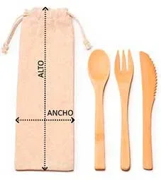 Set de cubiertos de bambú natural presentados en funda de algodón natural con cordón autocierre. Incluye tenedor, cuchillo y cuchara.