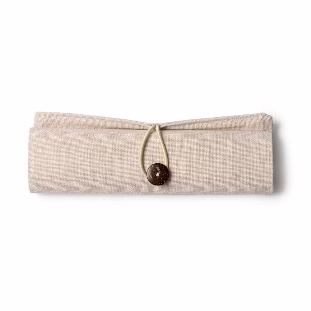 Set de escritura con regla realizada en bambú, lápiz de papel, bolígrafo de cartón, sacapuntas de madera y goma de borrar. Presentado en estuche de yute y algodón.