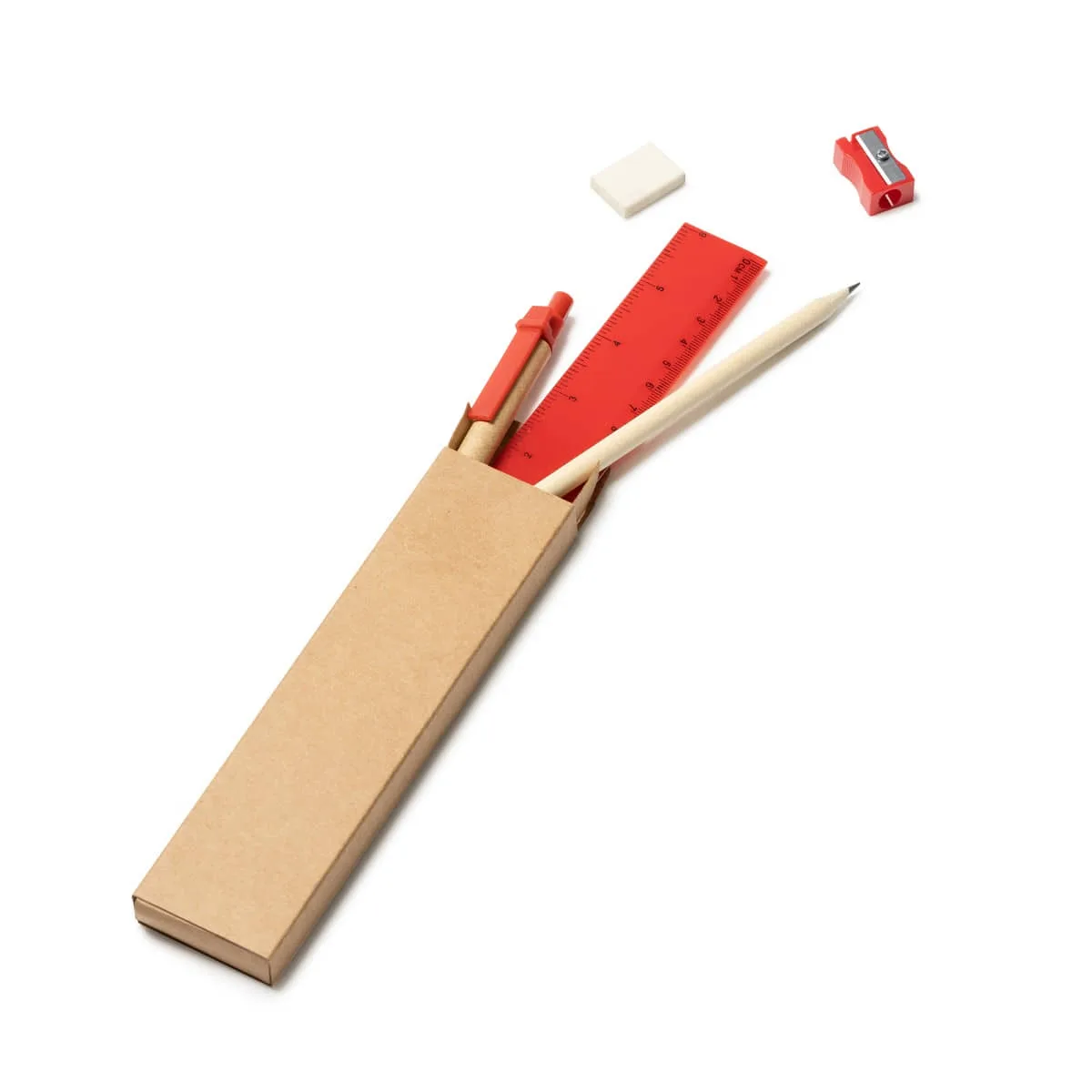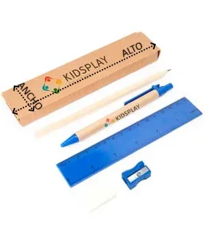 Set de 5 piezas presentadas en estuche de cartón kraft. Incluye bolígrafo con cuerpo de cartón y tinta azul, lápiz de madera, sacapuntas, goma y regla de 15cm.