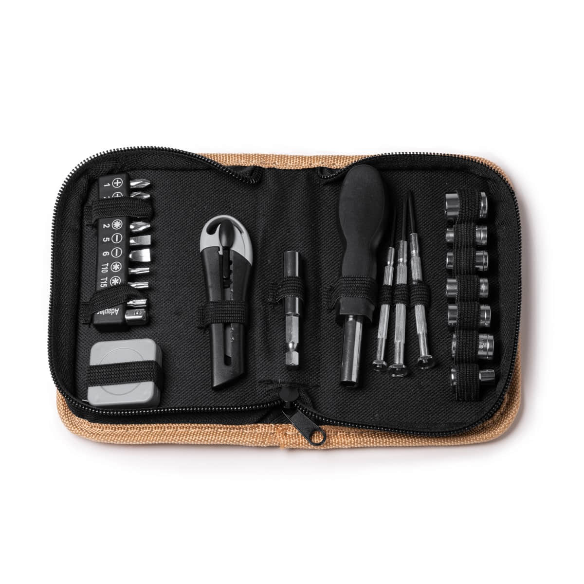 Set de herramientas con 25 accesorios. Cutter, llaves hexagonales, destornilladores de estrellas y planos, herramienta de fijación y metro de 100cm. Presentado en estuche de corcho y caja diseño eco.