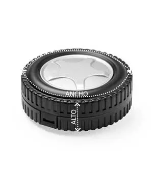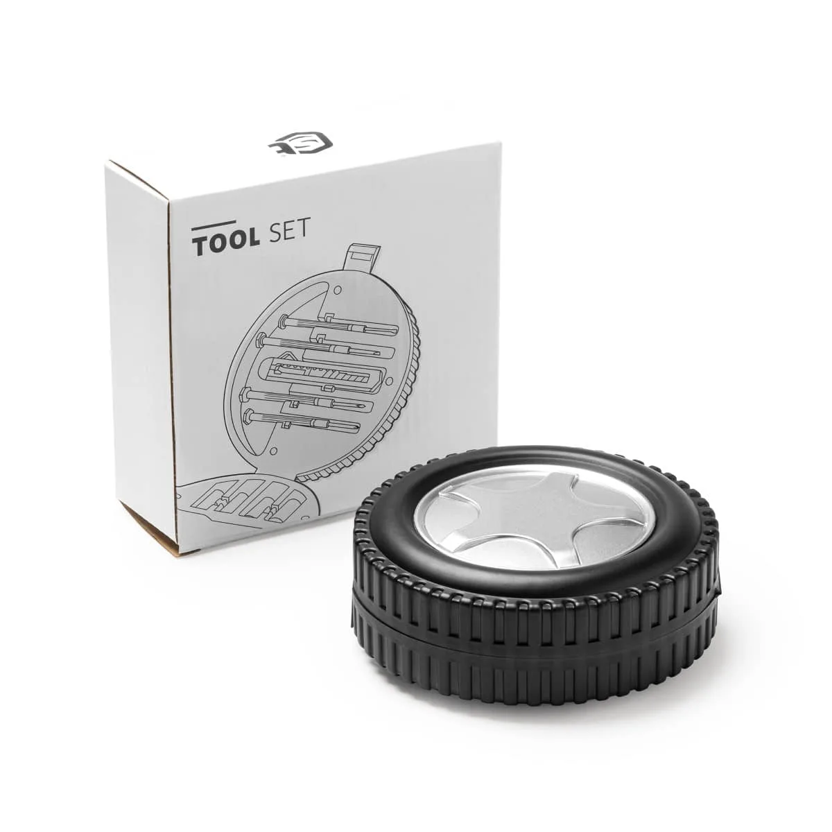 Set de herramientas con 20 accesorios: cutters, llaves hexagonales, destornilladores de estrella y planos y herramienta de fijación. El set de herramientas viene en un estuche con diseño de rueda.