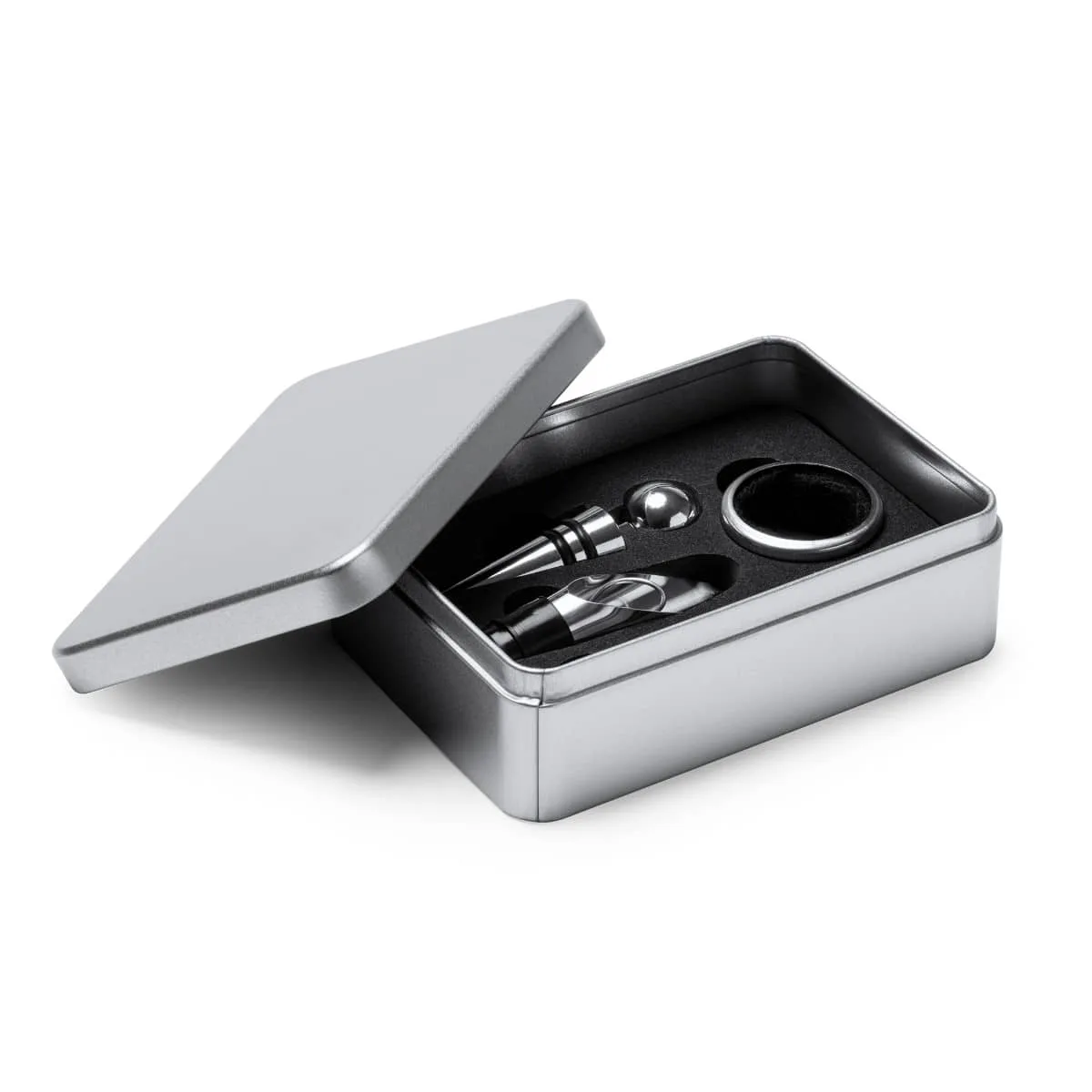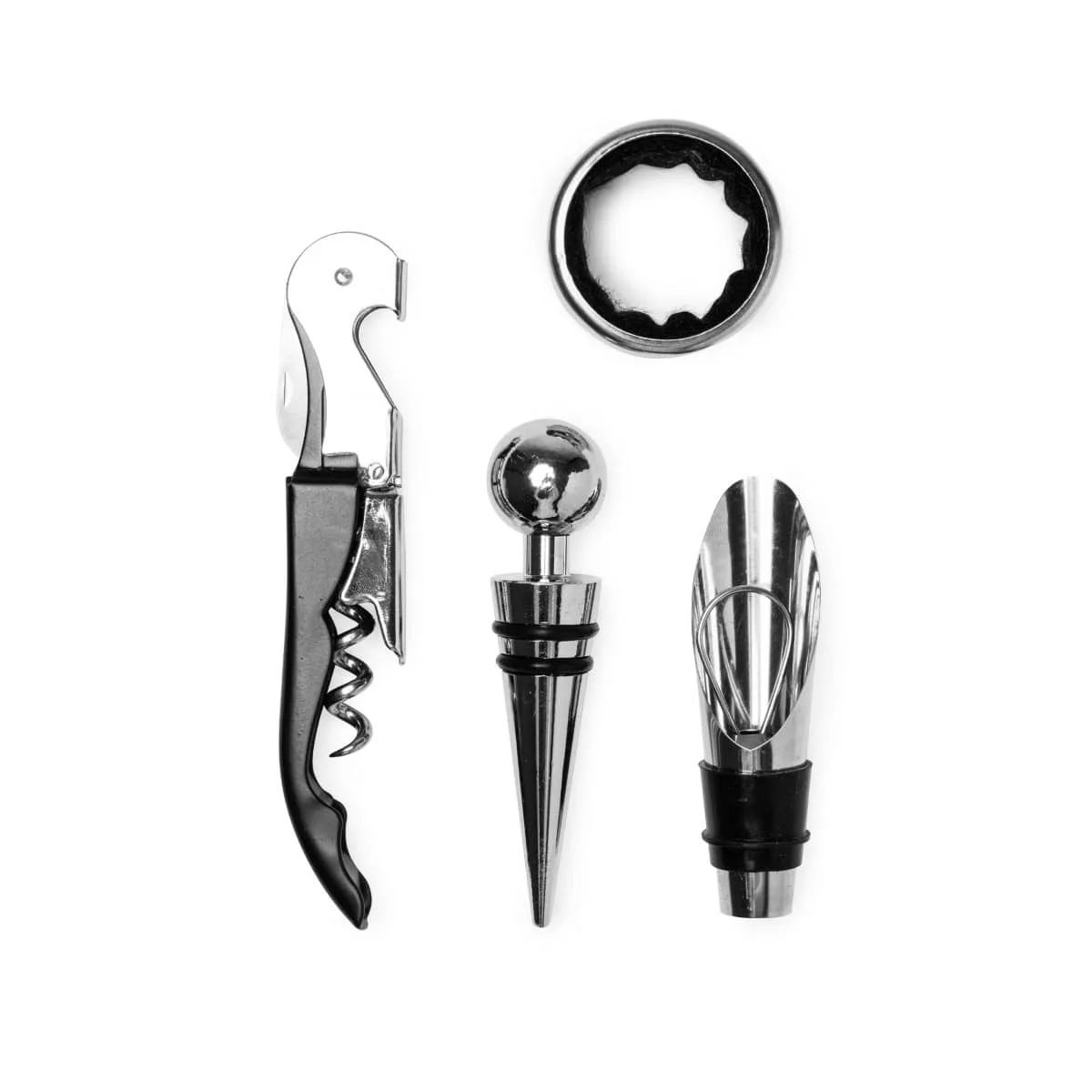Set de vino con accesorios de acero inoxidable, sacacorchos con cortacápsulas, recogegotas, tapón y dosificador.